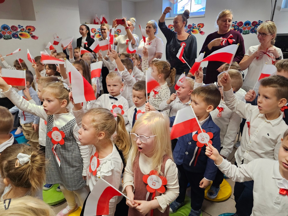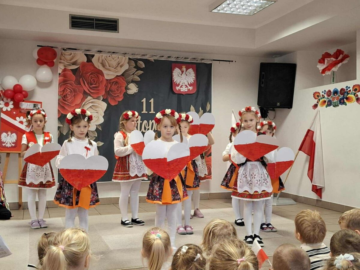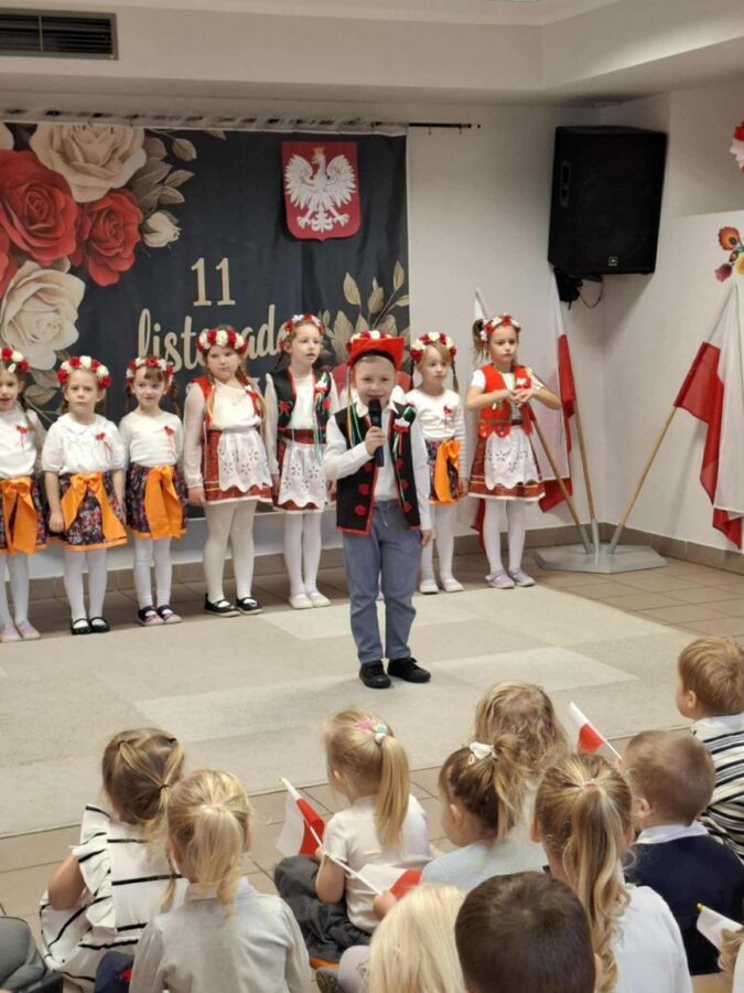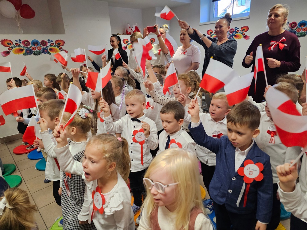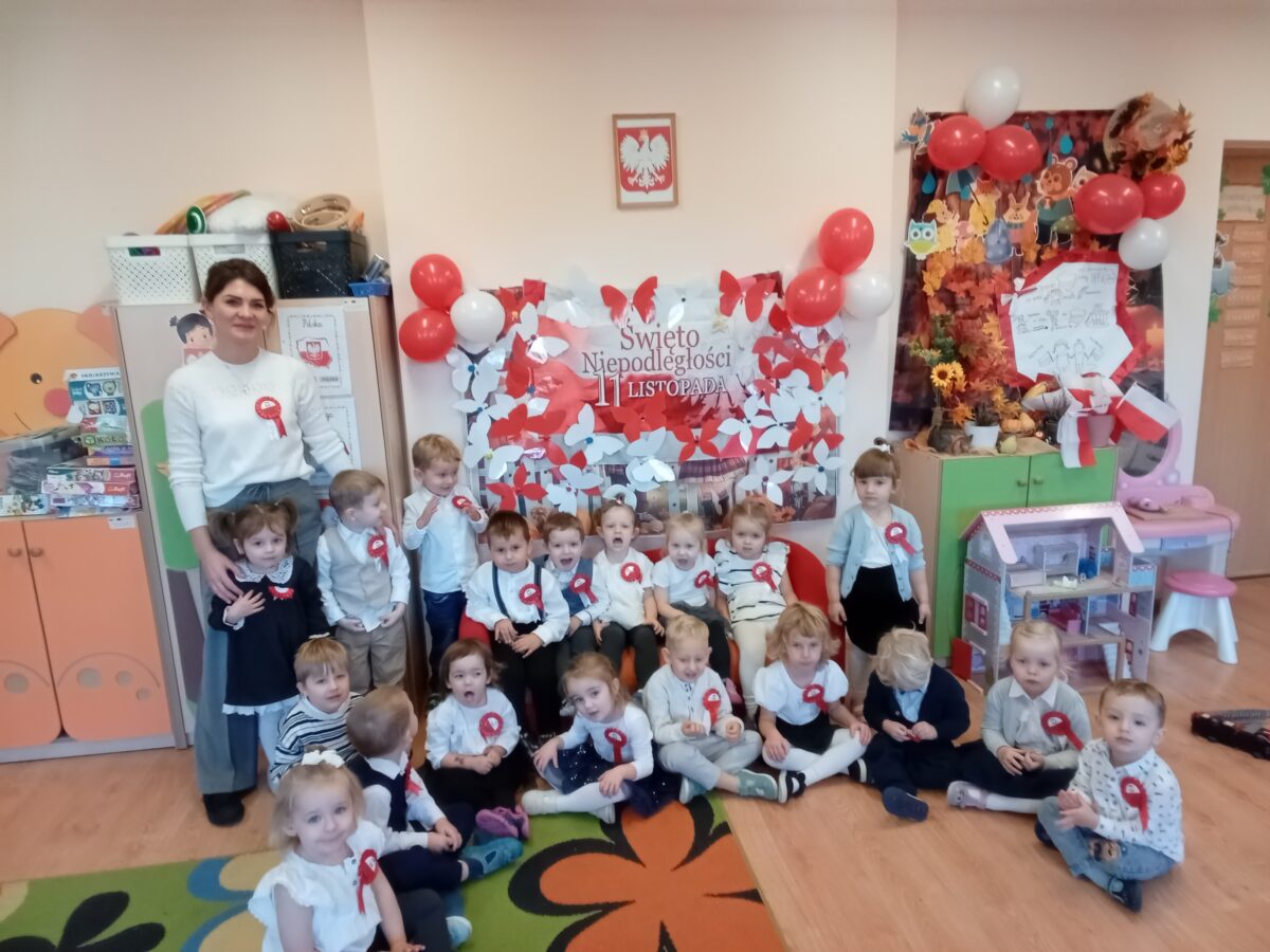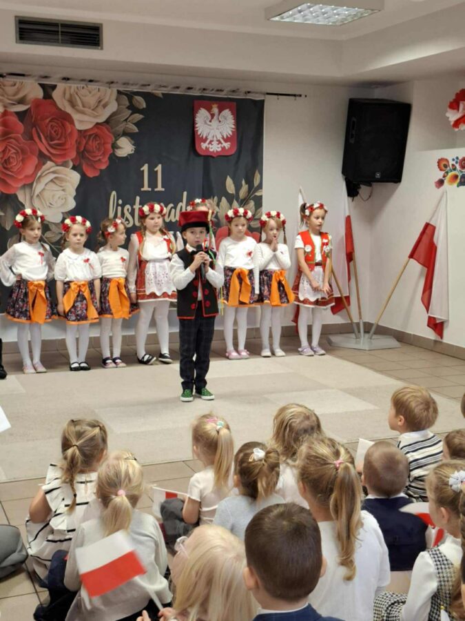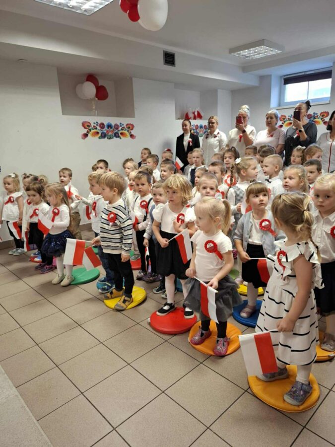 Dnia 07.11.2025 r. odbyła się uroczysta Akademia z okazji obchodów Dnia Niepodległości – 11 listopada. To wyjątkowy czas dla każdej Polki i Polaka. Z tej okazji dzieci z wszystkich grup oraz pracownicy przedszkola zebrali się, aby uroczyście świętować ten wyjątkowy dla Polaków czas. Wszyscy z powagą i w dużym skupieniu oglądali program artystyczny przygotowany przez dzieci ze starszej grupy przedszkolnej. Uroczystość z okazji Narodowego Święta Niepodległości miała na celu rozwijanie wśród wychowanków naszego przedszkola poczucia przynależności narodowej, pielęgnowanie polskiej kultury i tradycji. Jednocześnie była pouczającą lekcją historii i patriotyzmu.