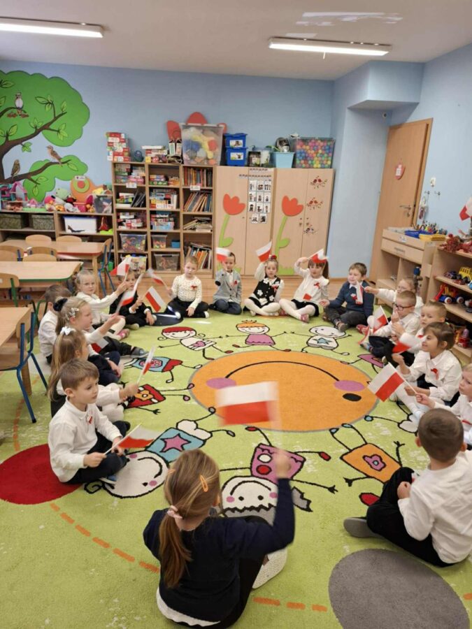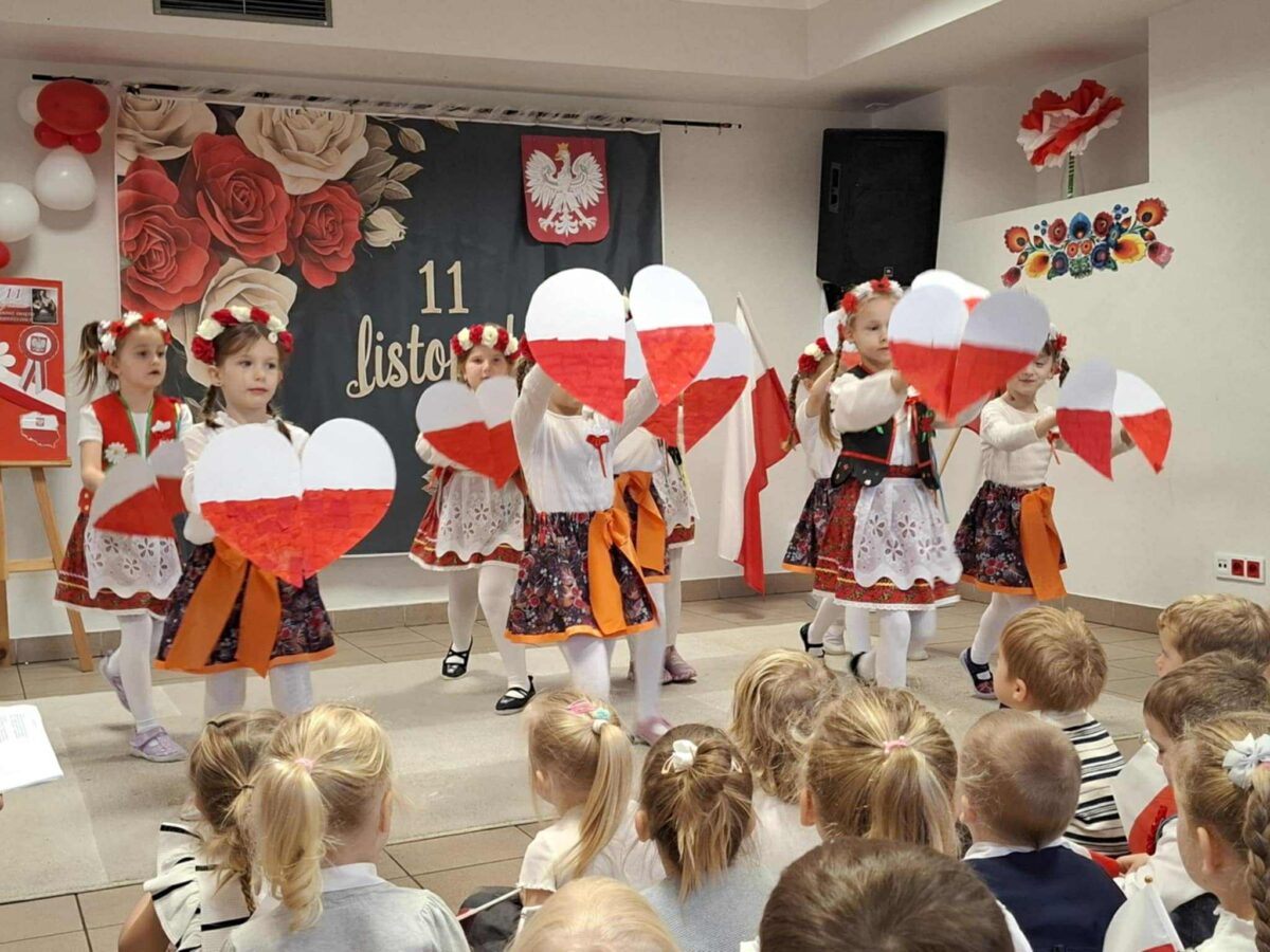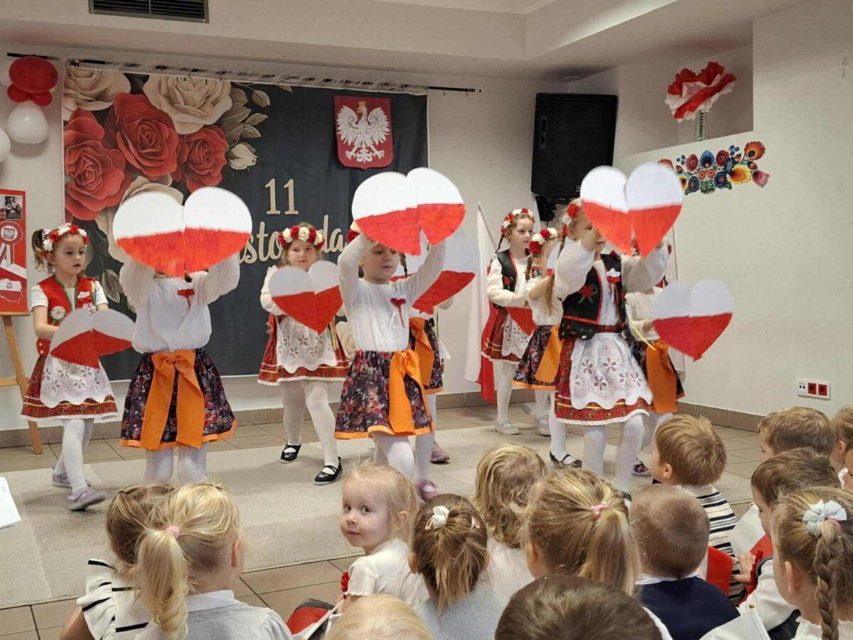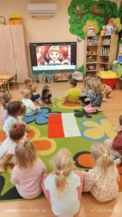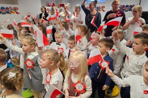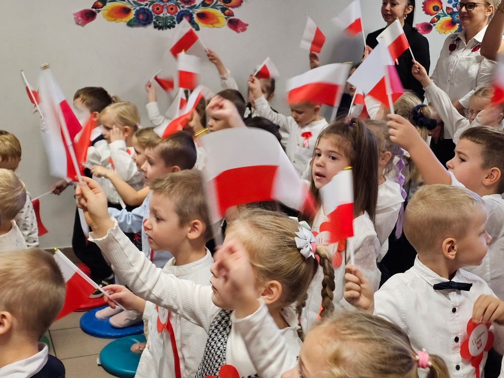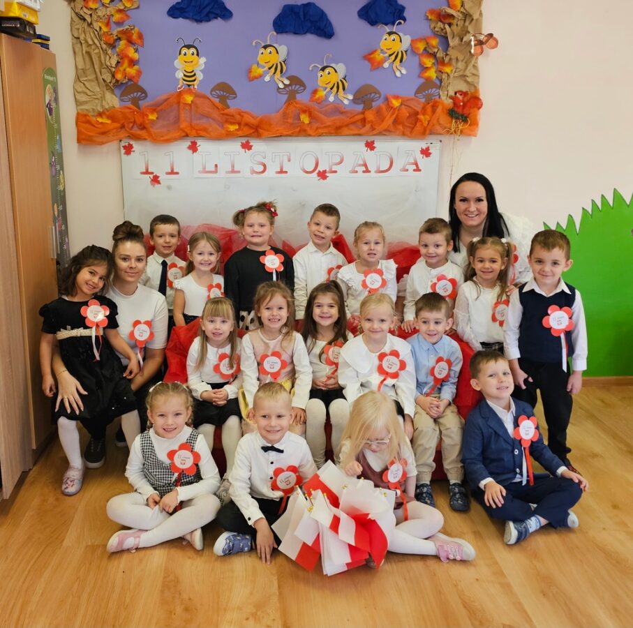 Dnia 07.11.2025 r. odbyła się uroczysta Akademia z okazji obchodów Dnia Niepodległości – 11 listopada. To wyjątkowy czas dla każdej Polki i Polaka. Z tej okazji dzieci z wszystkich grup oraz pracownicy przedszkola zebrali się, aby uroczyście świętować ten wyjątkowy dla Polaków czas. Wszyscy z powagą i w dużym skupieniu oglądali program artystyczny przygotowany przez dzieci ze starszej grupy przedszkolnej. Uroczystość z okazji Narodowego Święta Niepodległości miała na celu rozwijanie wśród wychowanków naszego przedszkola poczucia przynależności narodowej, pielęgnowanie polskiej kultury i tradycji. Jednocześnie była pouczającą lekcją historii i patriotyzmu.