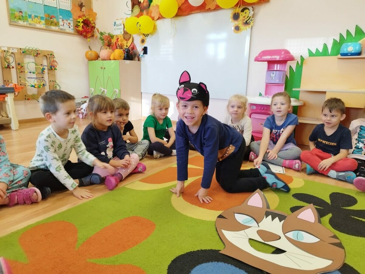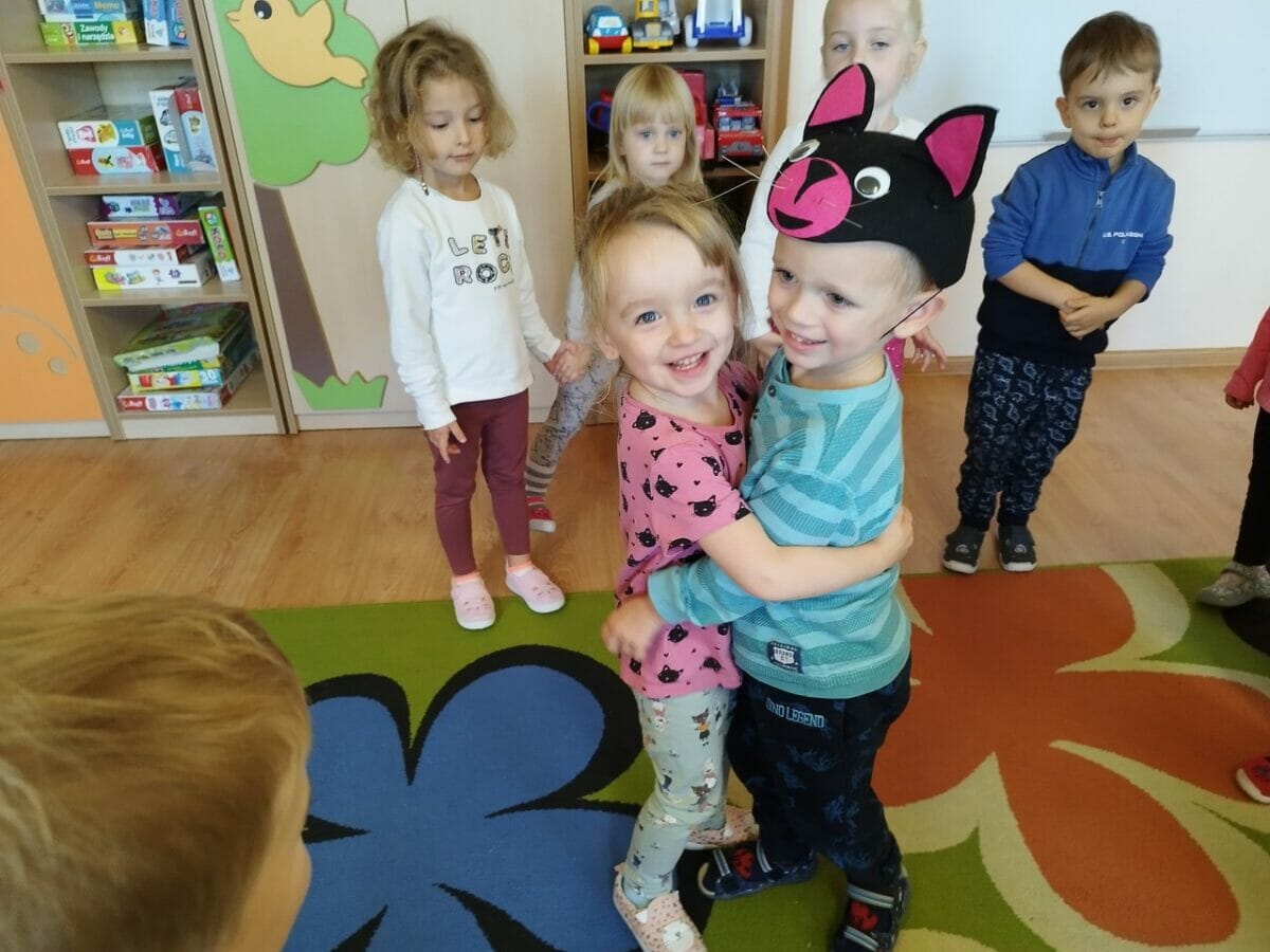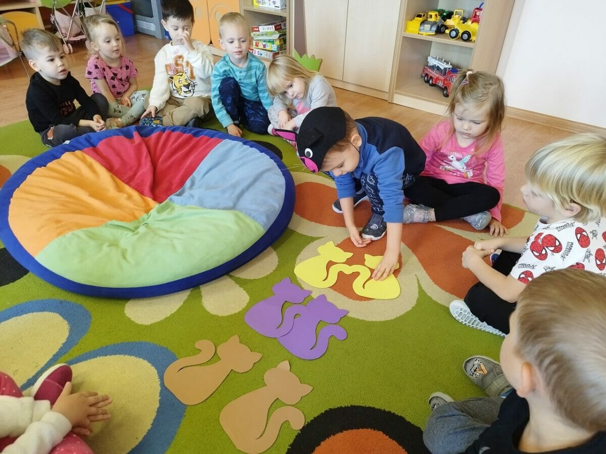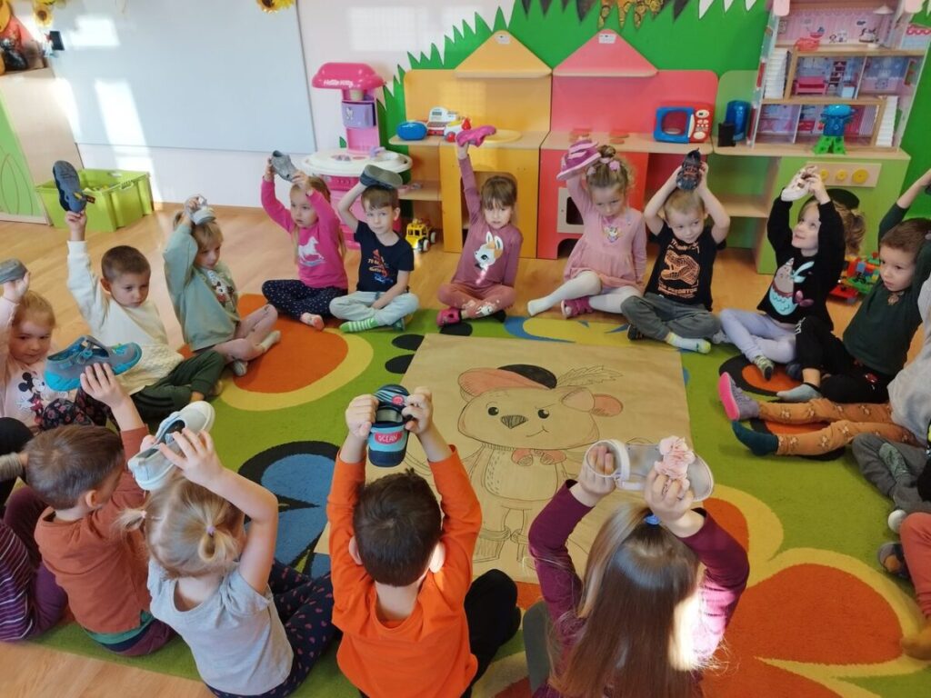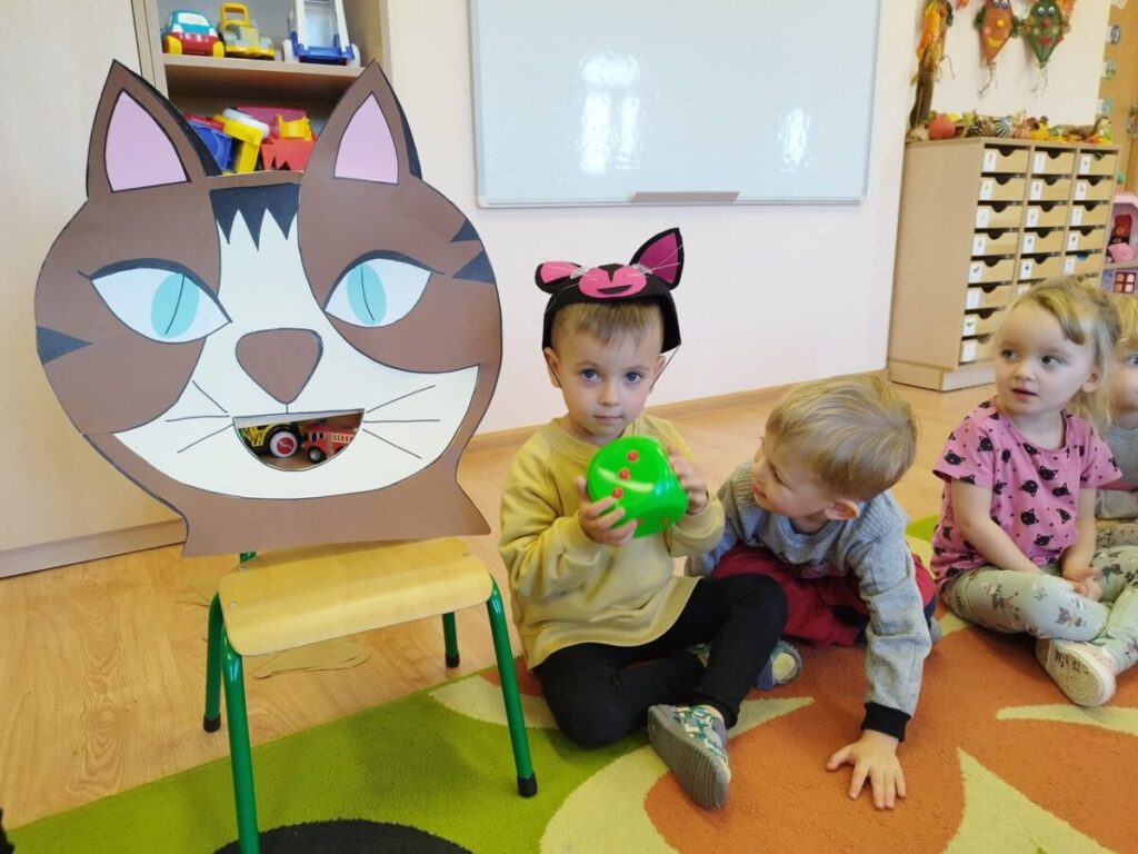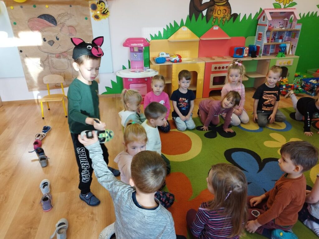 Podczas słuchania bajki dzieci przeniosły się w świat „Kota w butach”. Układały z figur geometrycznych kota, szukały par butów, karmiły kota wylosowaną ilością myszek oraz tańczyły i śpiewały.