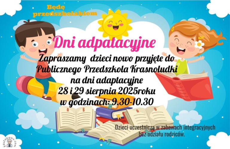 Serdecznie zapraszamy na dni adaptacyjne, które odbędą się w dniach 28.08-29.08. 2025 r.(czwartek- piątek) w godzinach 9:30-10:30.