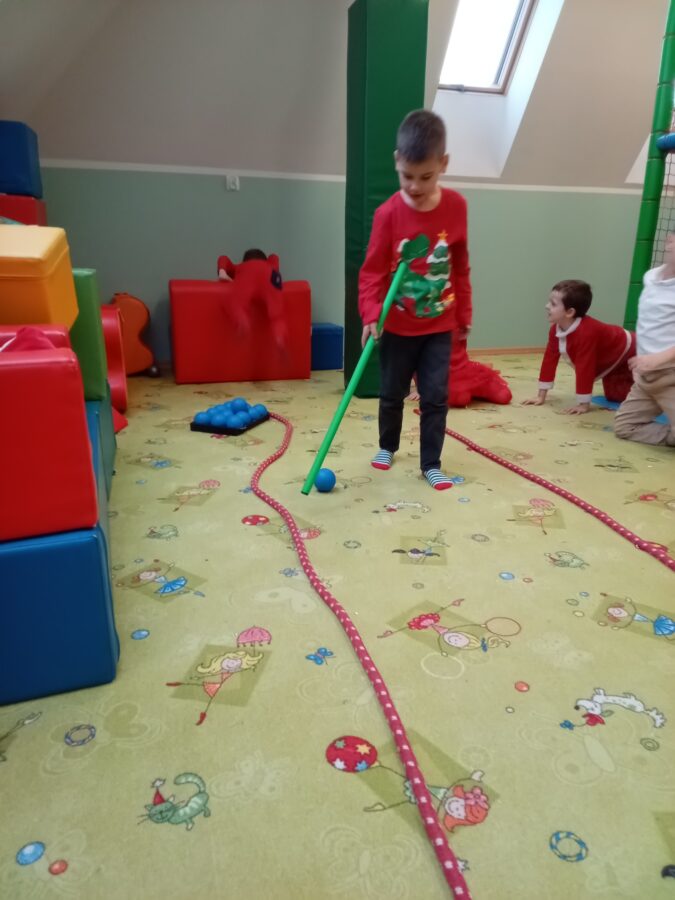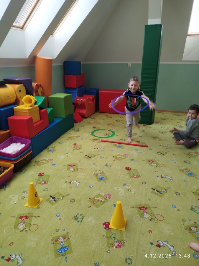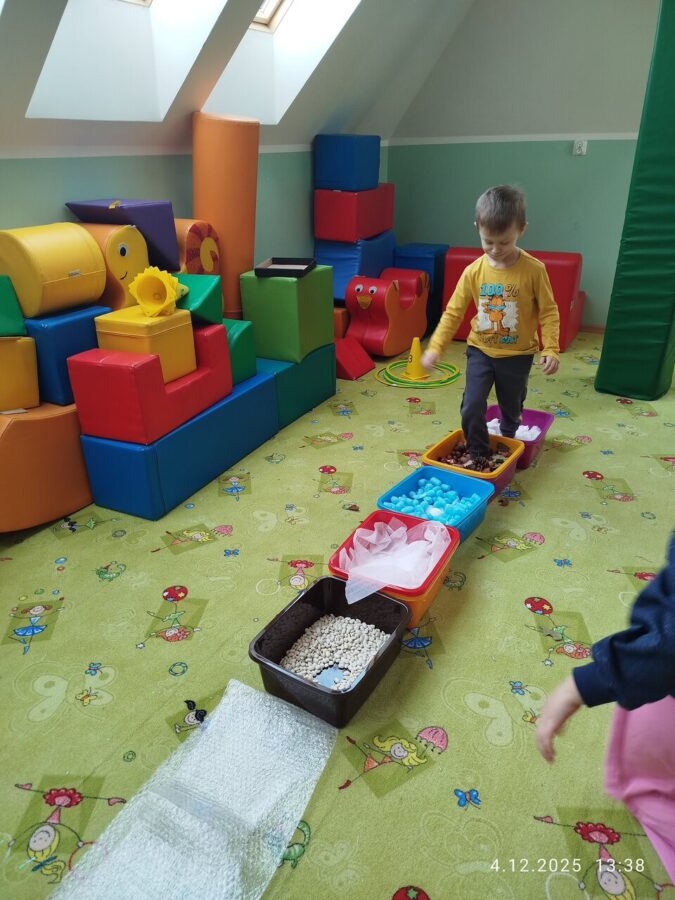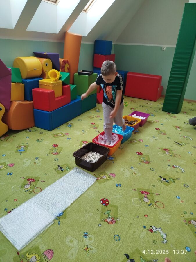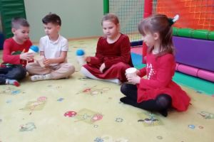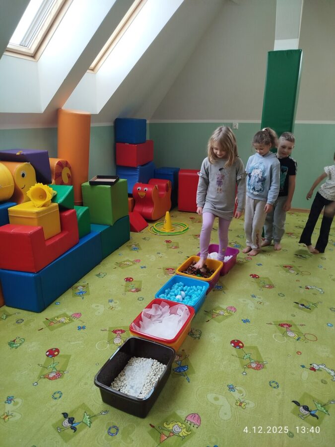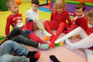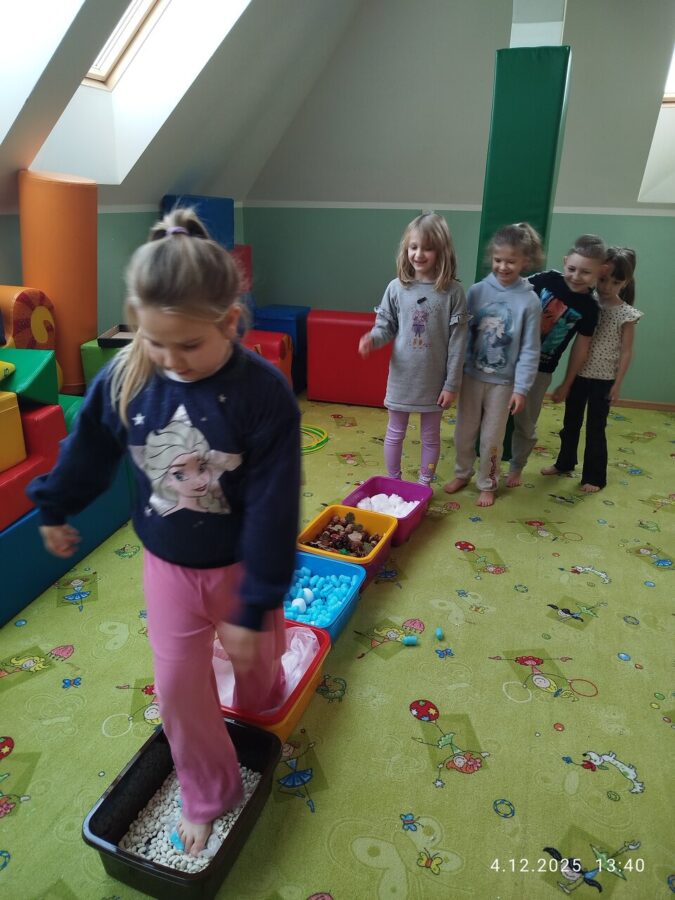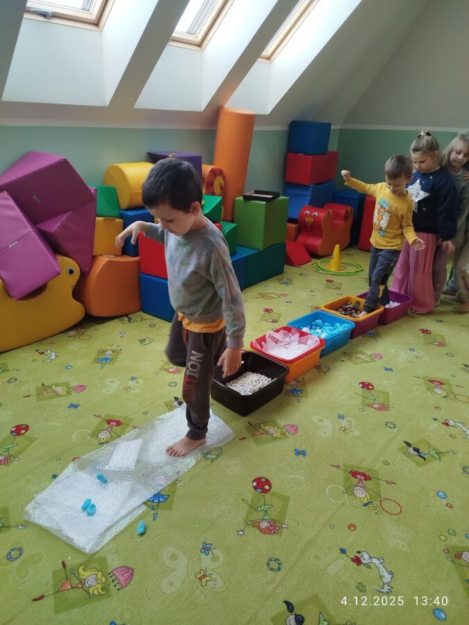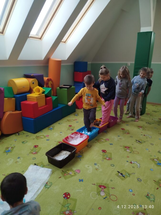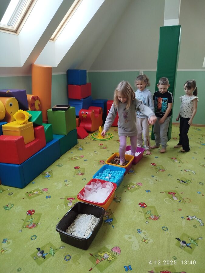 W grudniu dzieci z grupy Jeżyki aktywnie uczestniczyły w proponowanych zabawach z elementami integracji sensorycznej.Zabawy i ćwiczenia stymulujące zmysły:dotyku, wzroku, słuchu oraz równowagę i koordynację wzrokowo-ruchową były z zaangażowaniem wykonywane przez dzieci.
