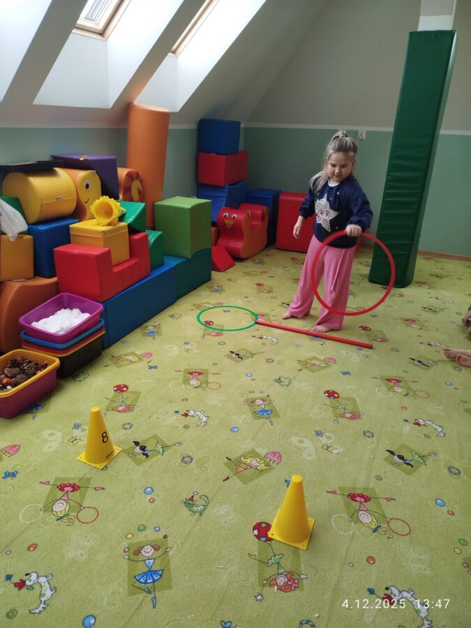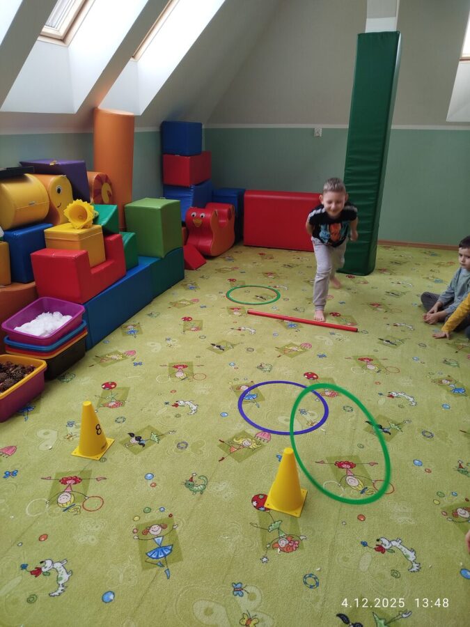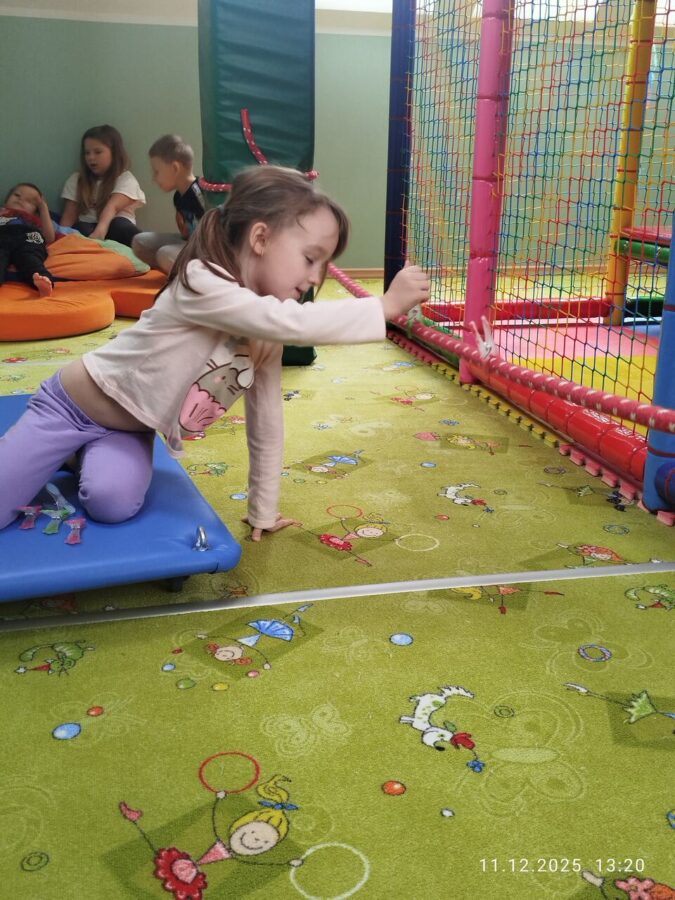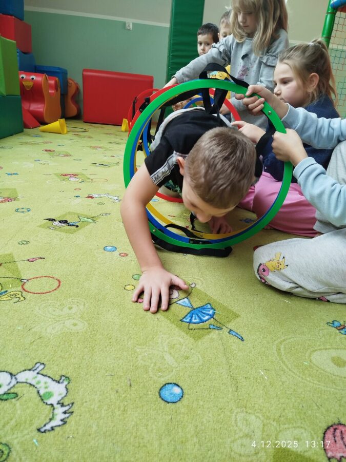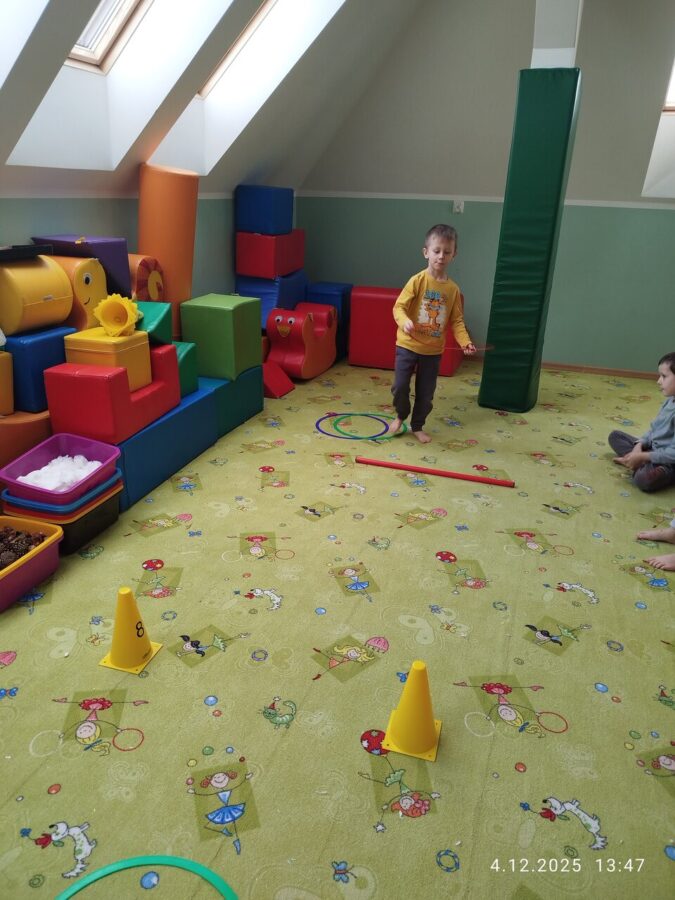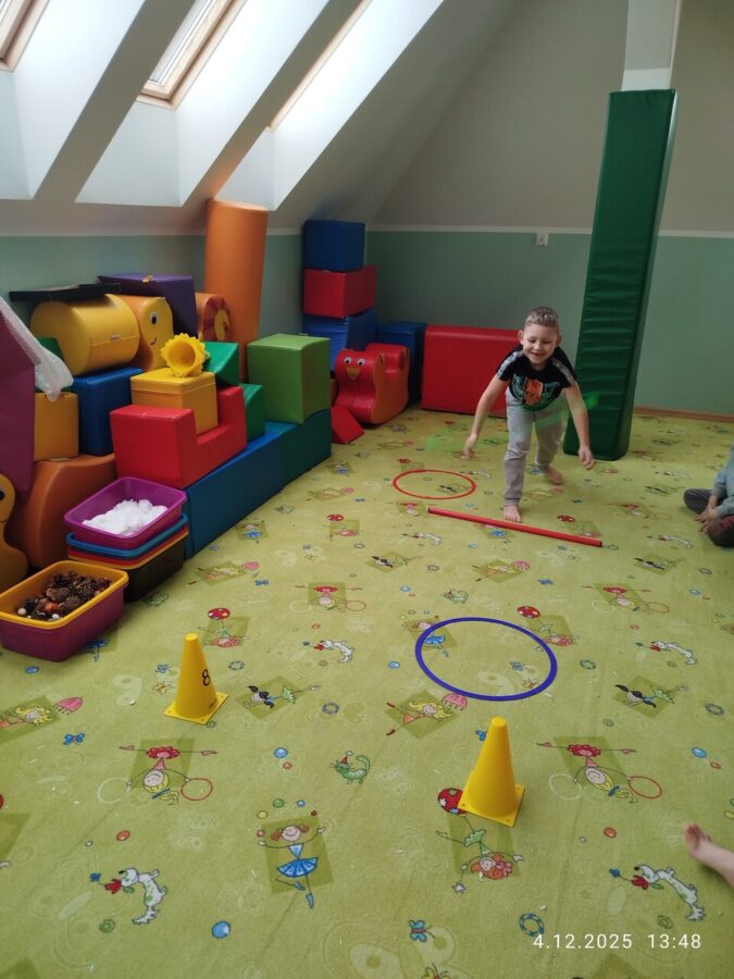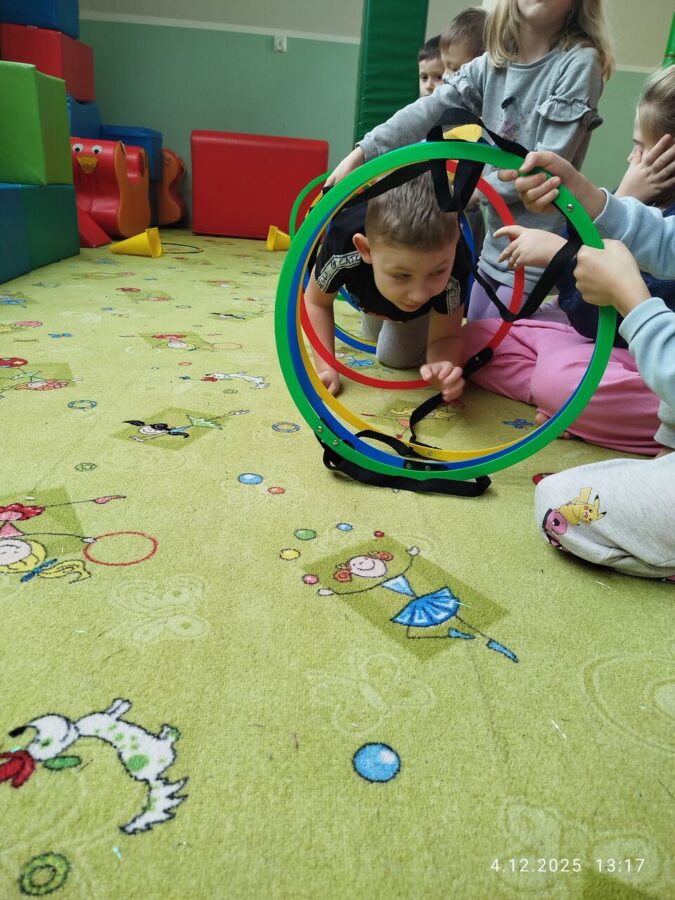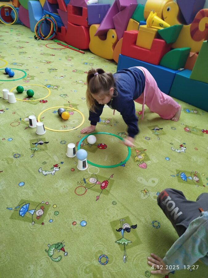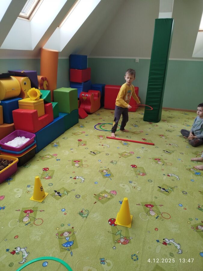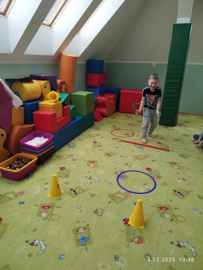 W grudniu dzieci z grupy Jeżyki aktywnie uczestniczyły w proponowanych zabawach z elementami integracji sensorycznej.Zabawy i ćwiczenia stymulujące zmysły:dotyku, wzroku, słuchu oraz równowagę i koordynację wzrokowo-ruchową były z zaangażowaniem wykonywane przez dzieci.