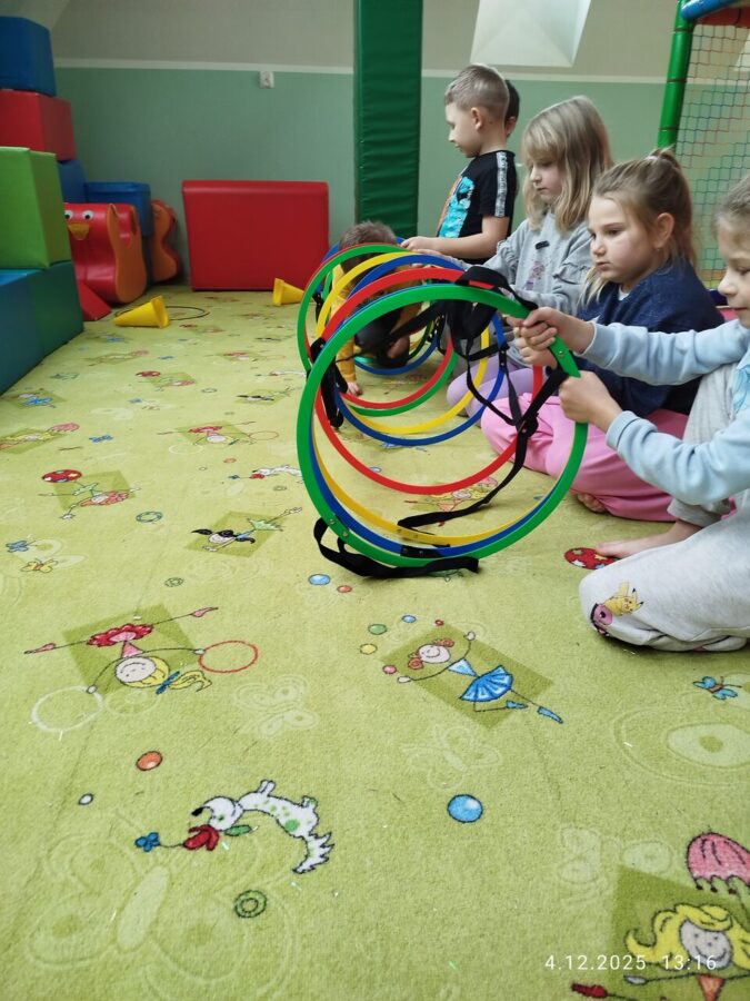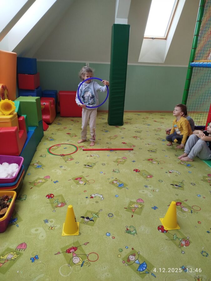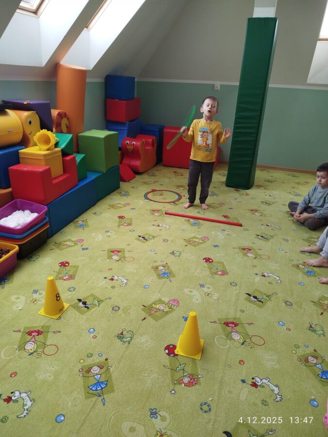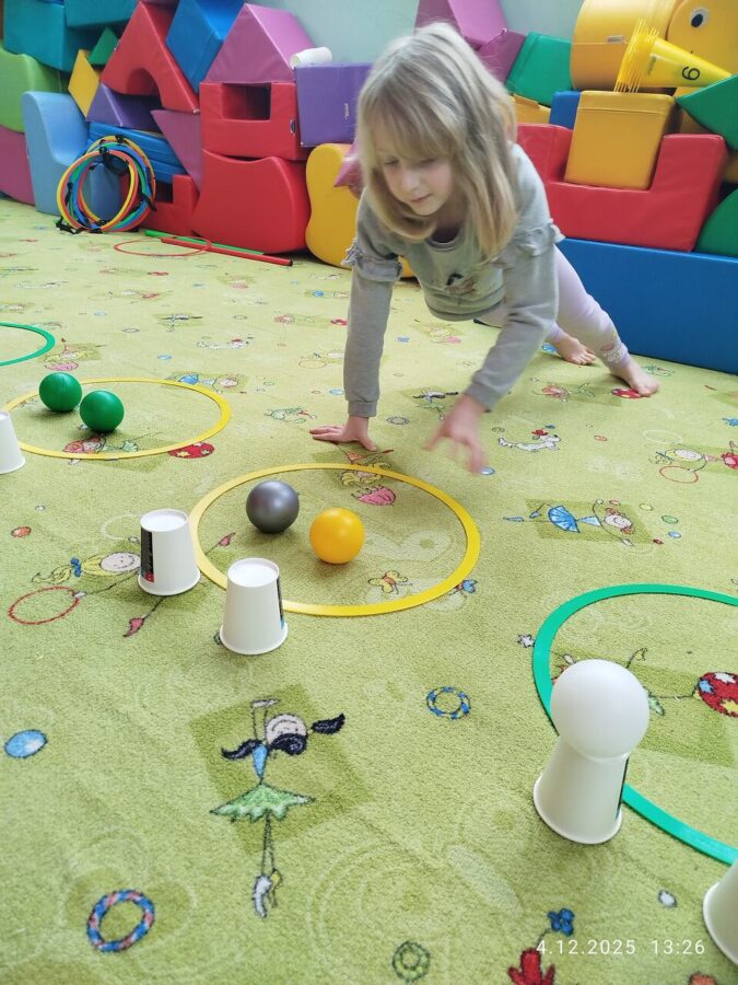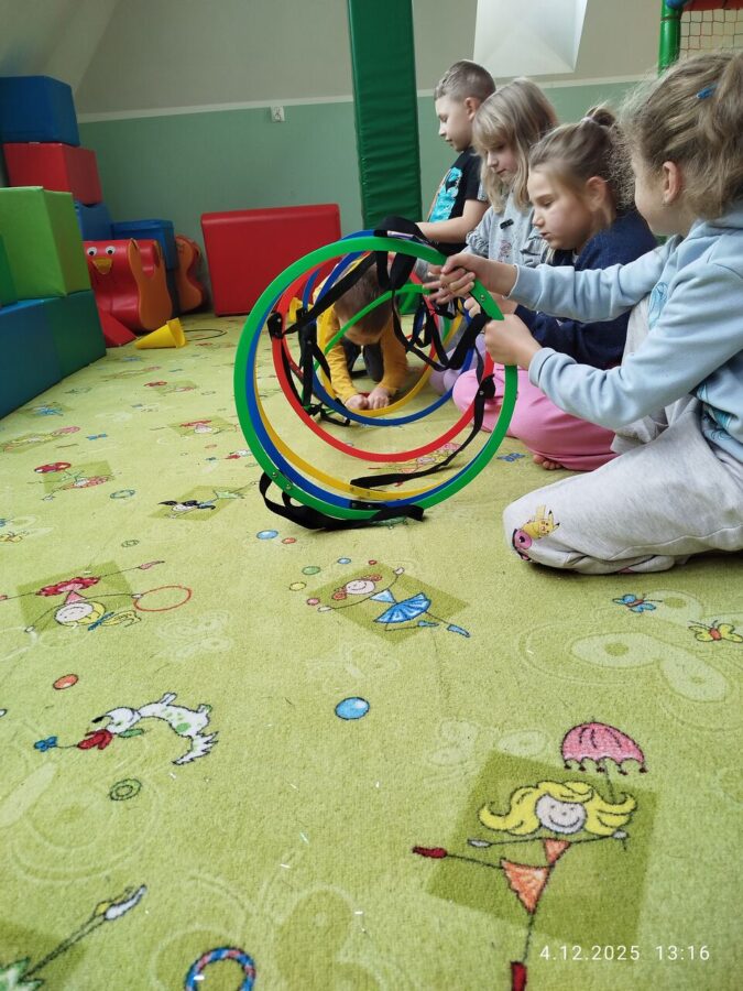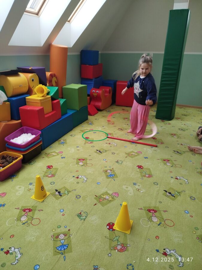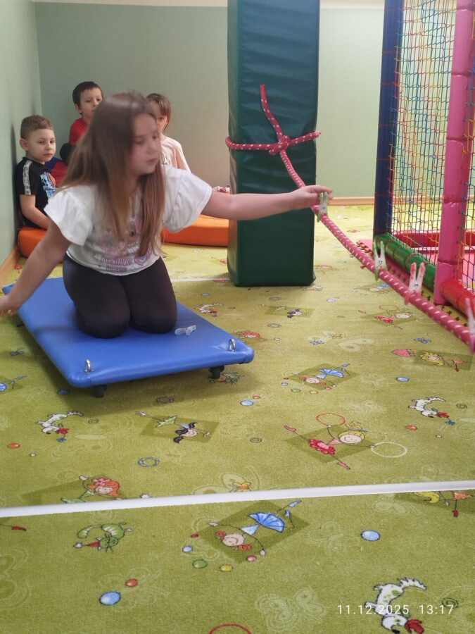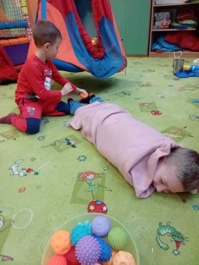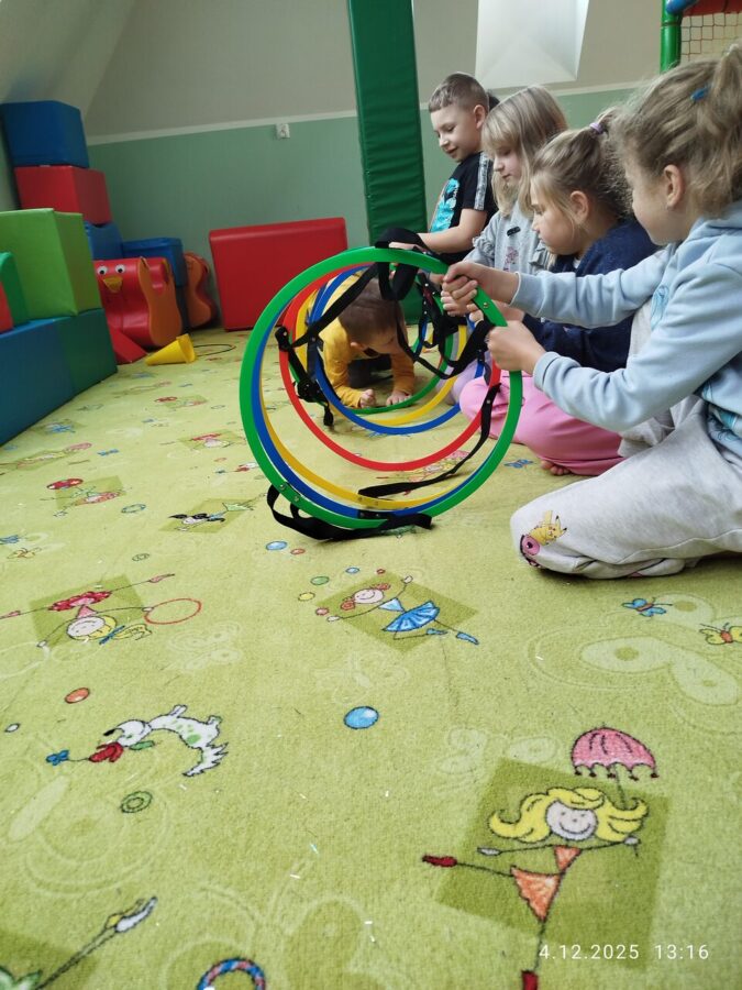 W grudniu dzieci z grupy Jeżyki aktywnie uczestniczyły w proponowanych zabawach z elementami integracji sensorycznej.Zabawy i ćwiczenia stymulujące zmysły:dotyku, wzroku, słuchu oraz równowagę i koordynację wzrokowo-ruchową były z zaangażowaniem wykonywane przez dzieci.