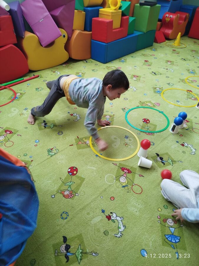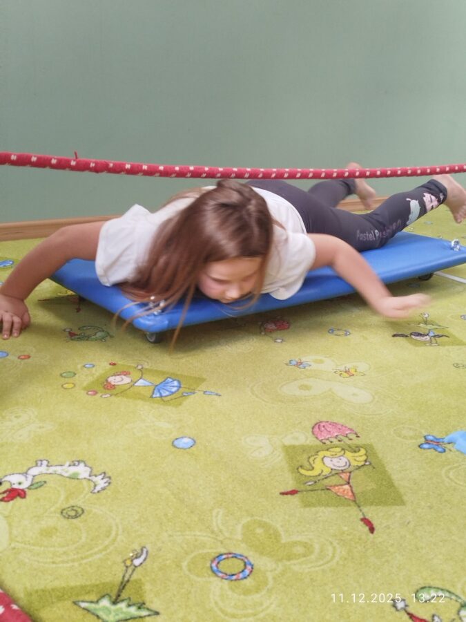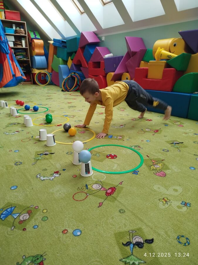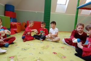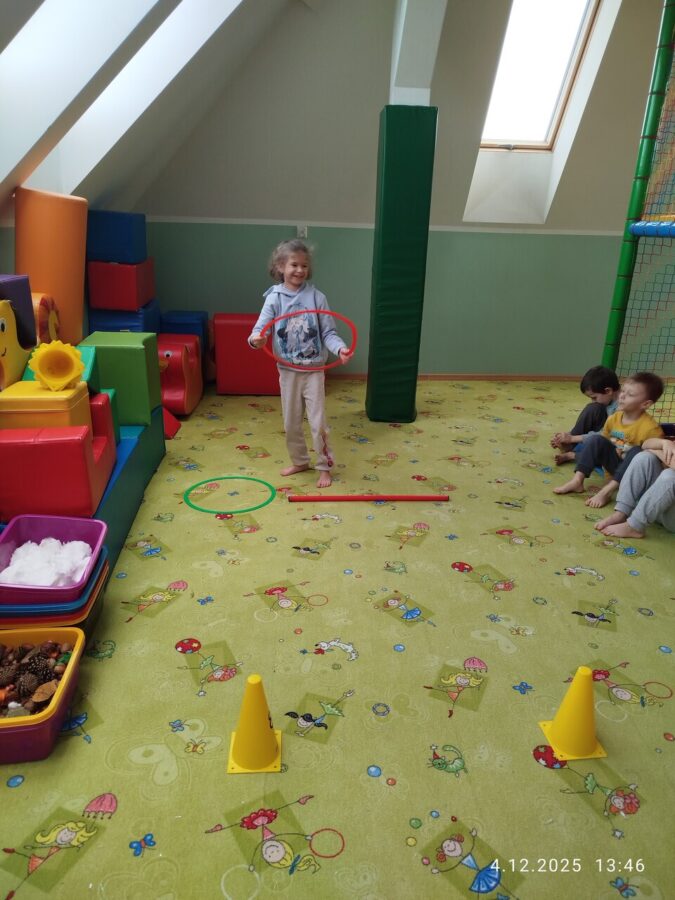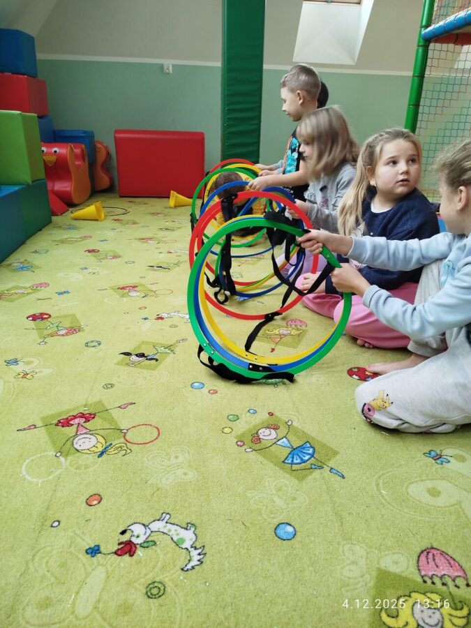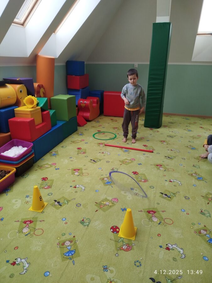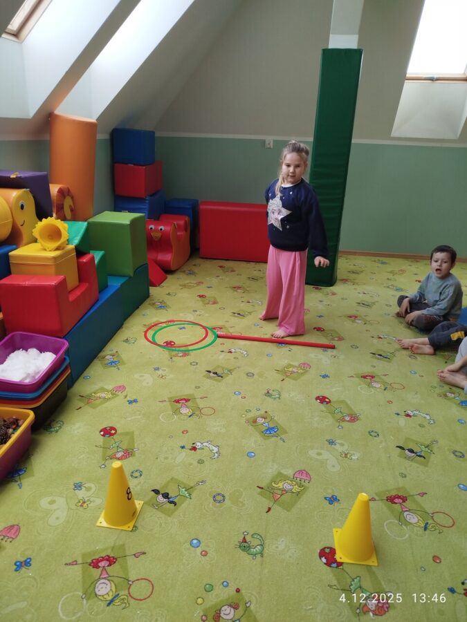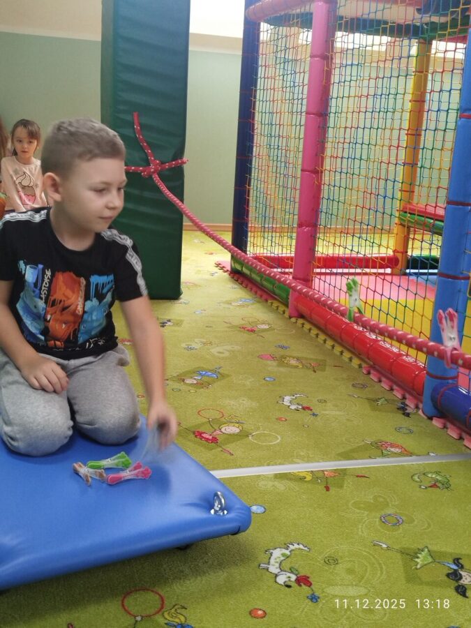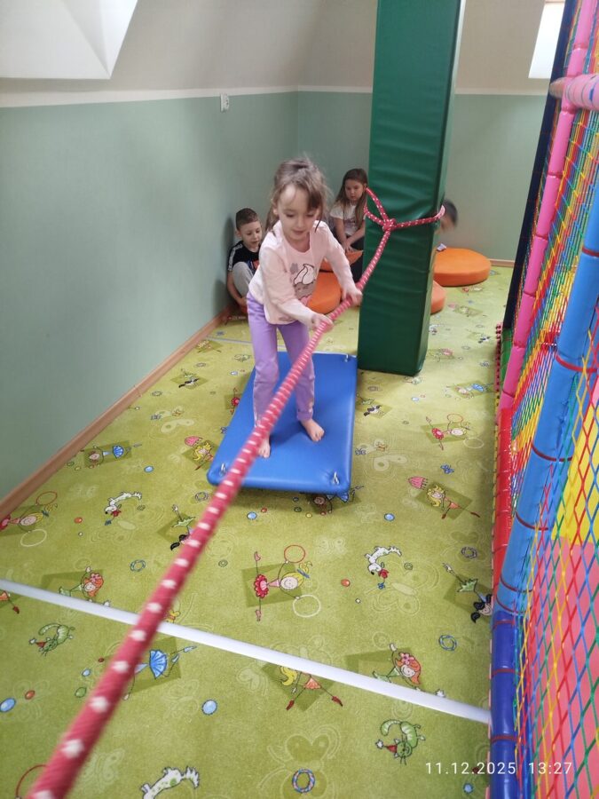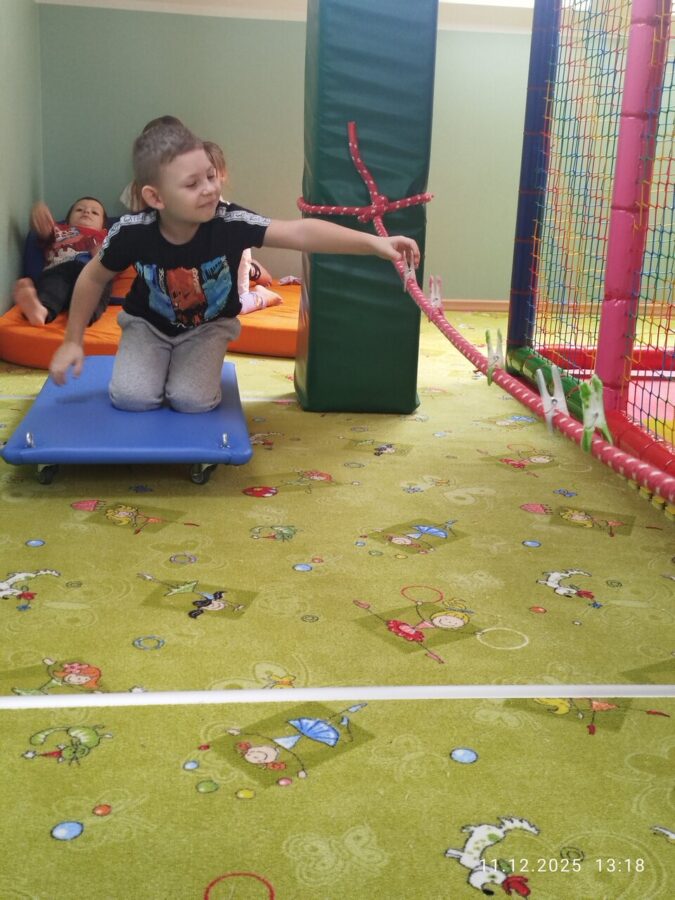 W grudniu dzieci z grupy Jeżyki aktywnie uczestniczyły w proponowanych zabawach z elementami integracji sensorycznej.Zabawy i ćwiczenia stymulujące zmysły:dotyku, wzroku, słuchu oraz równowagę i koordynację wzrokowo-ruchową były z zaangażowaniem wykonywane przez dzieci.