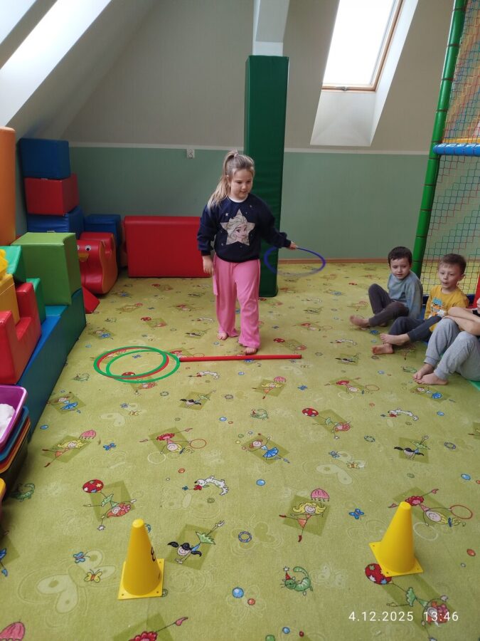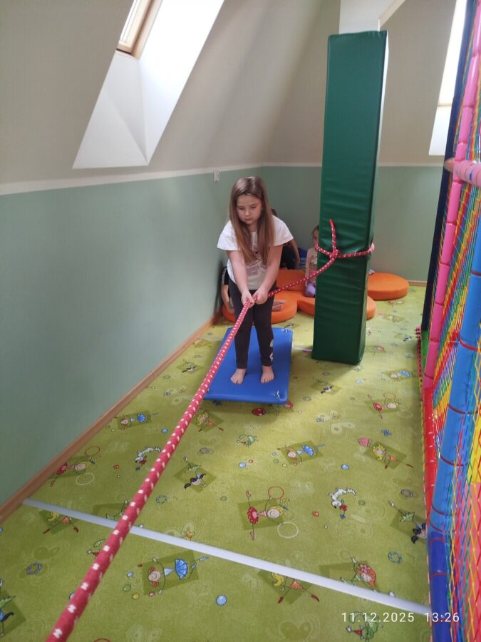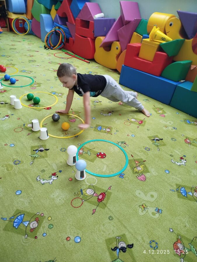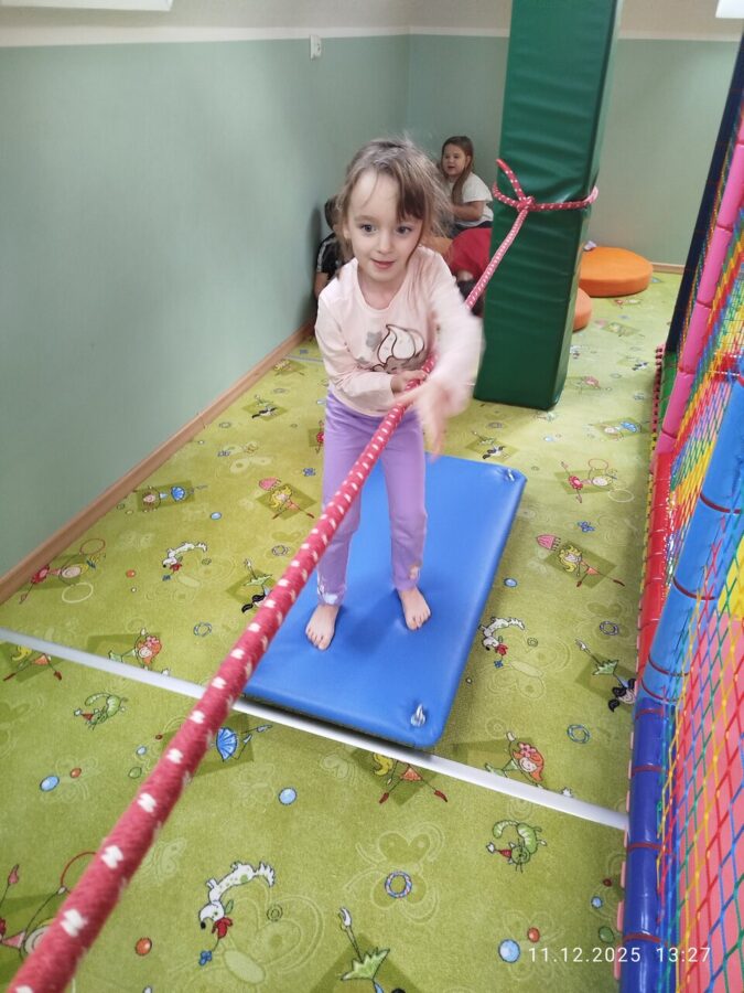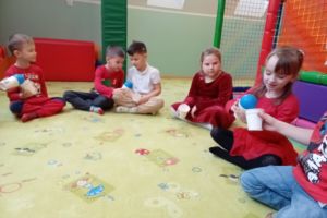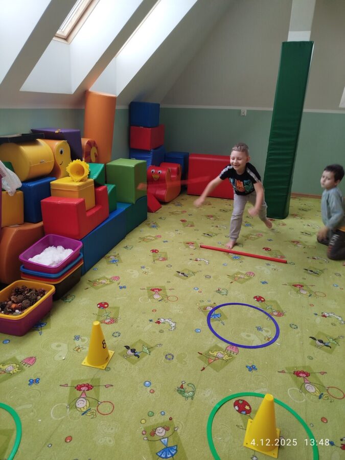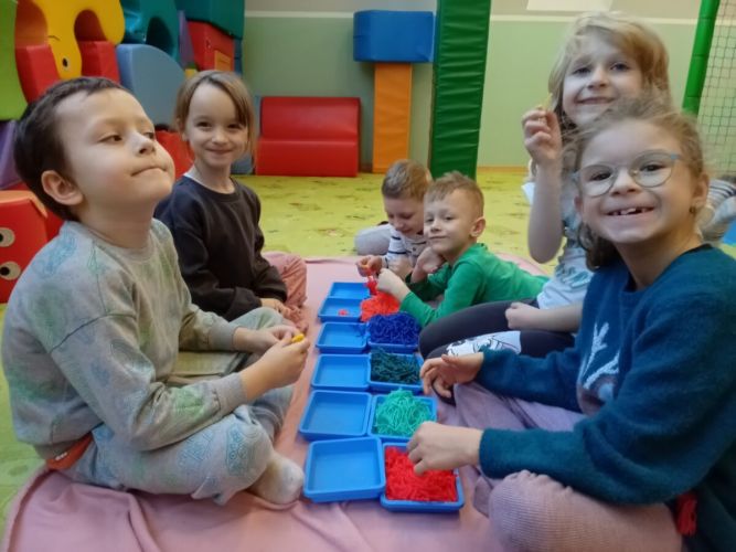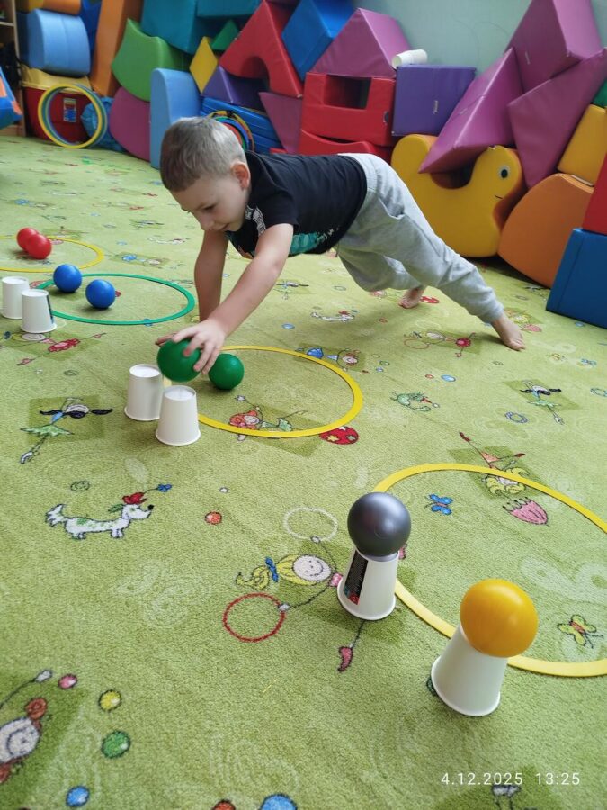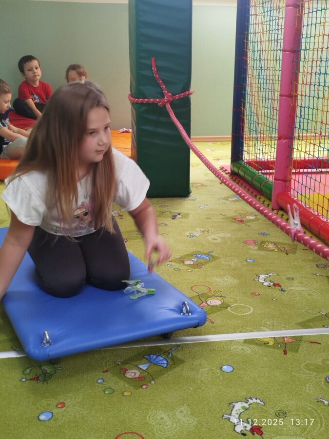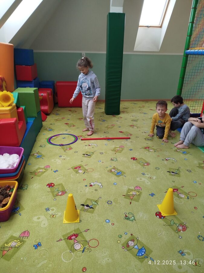 W grudniu dzieci z grupy Jeżyki aktywnie uczestniczyły w proponowanych zabawach z elementami integracji sensorycznej.Zabawy i ćwiczenia stymulujące zmysły:dotyku, wzroku, słuchu oraz równowagę i koordynację wzrokowo-ruchową były z zaangażowaniem wykonywane przez dzieci.