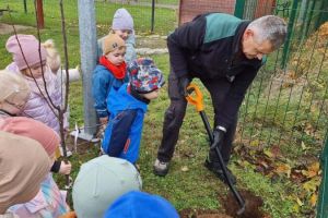 W dniu 31.10.2024r. na zielonym terenie wokół przedszkola dzieci posadziły dwa młode drzewka- śliwę oraz gruszę. Działania te odbyły się w ramach akcji “Zaadoptuj Drzewo” będącej częścią projektu “Wdrożenie działań ekologicznych w Zespole Szkół Ponadpodstawowych w Zgorzelcu w zakresie sadownictwa ekologicznego”.