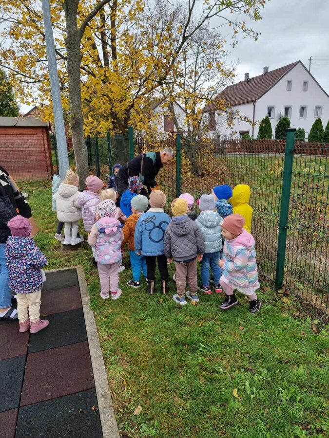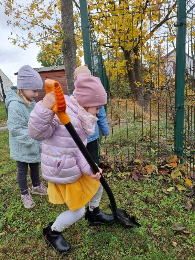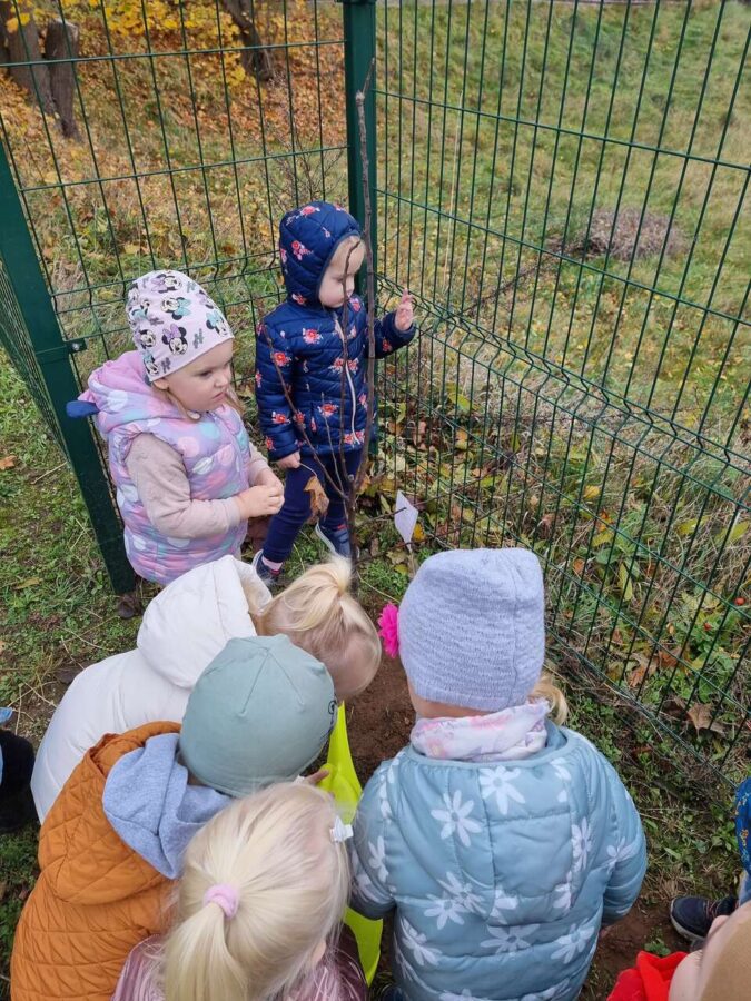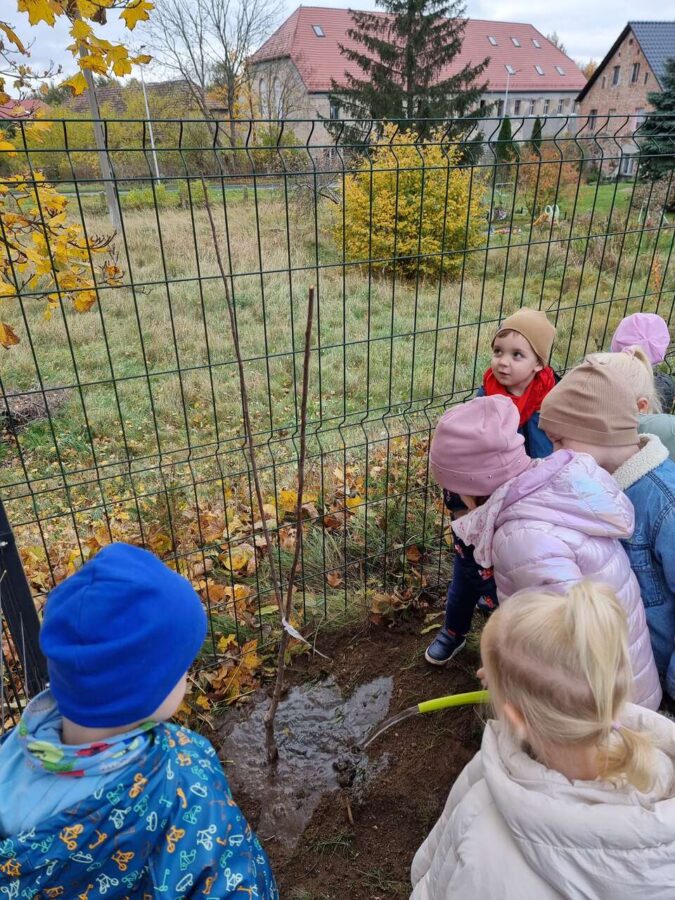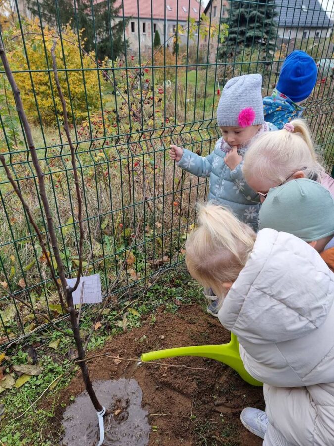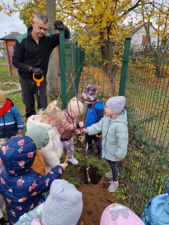 W dniu 31.10.2024r. na zielonym terenie wokół przedszkola dzieci posadziły dwa młode drzewka- śliwę oraz gruszę. Działania te odbyły się w ramach akcji “Zaadoptuj Drzewo” będącej częścią projektu “Wdrożenie działań ekologicznych w Zespole Szkół Ponadpodstawowych w Zgorzelcu w zakresie sadownictwa ekologicznego”.