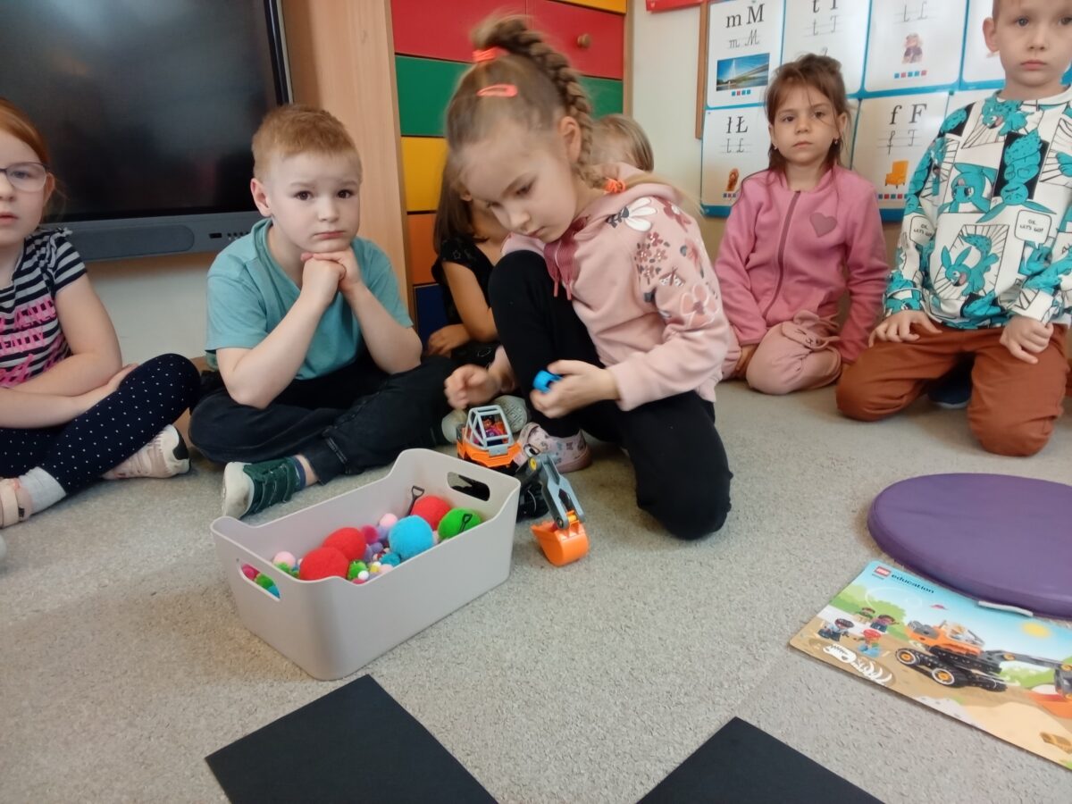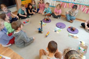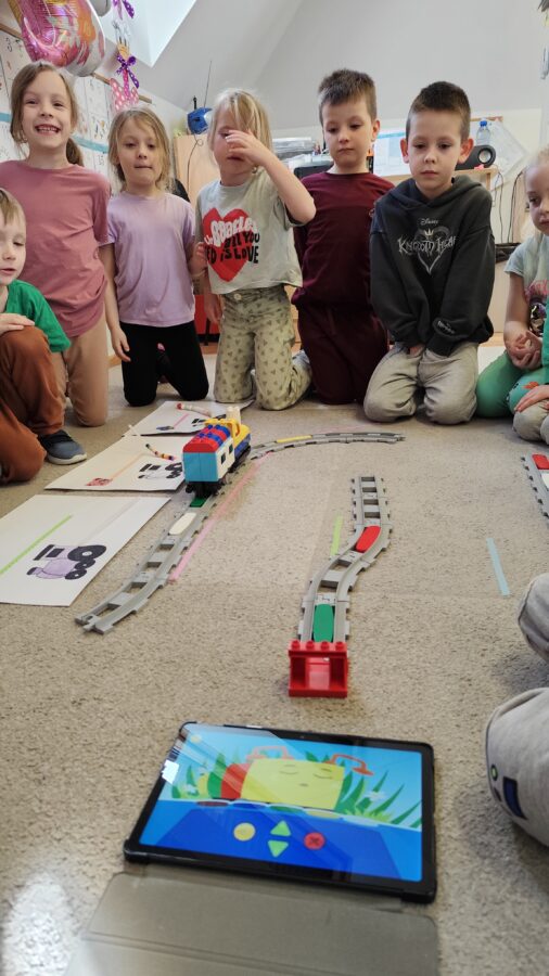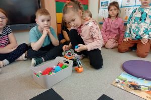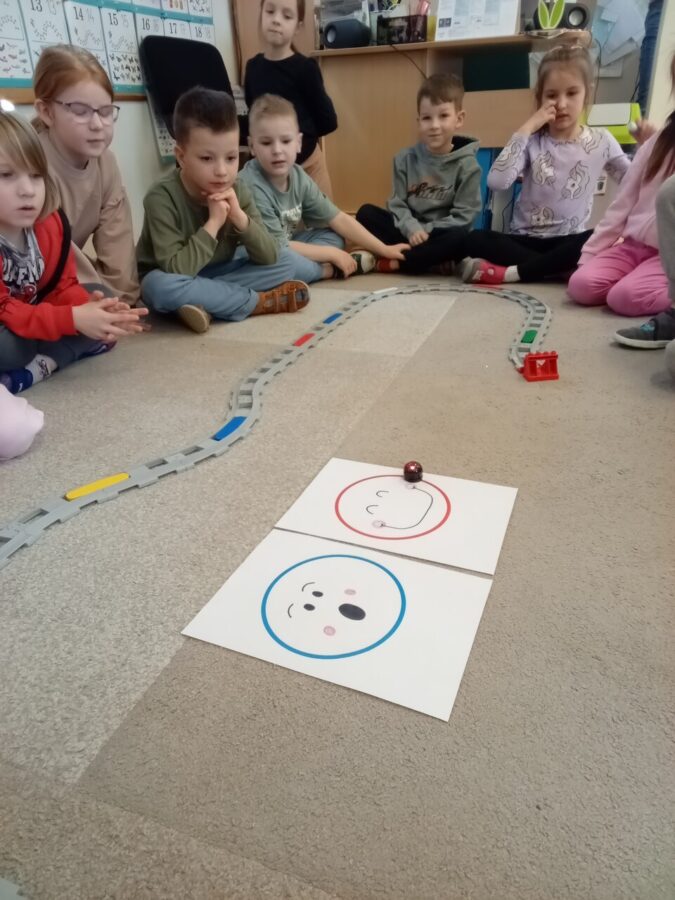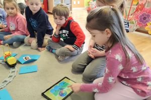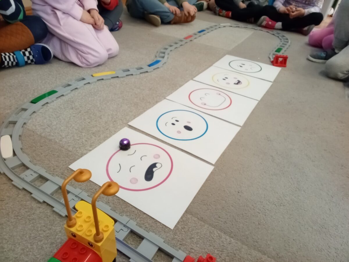-Emocje- gąsienica. Dzieci odróżniały emocje, próbowały je zrozumieć, korzystając z aplikacji wprawiały w ruch gąsienice oraz zmieniały działanie płytek funkcyjnych.