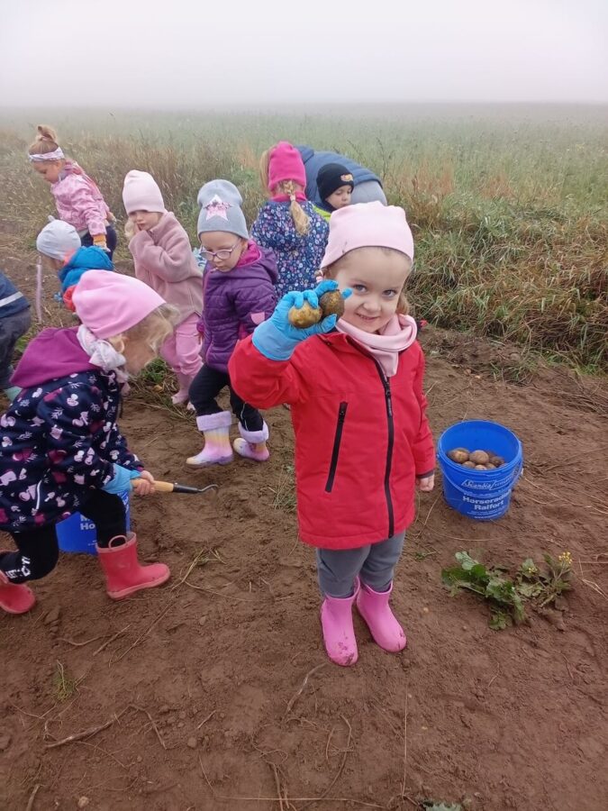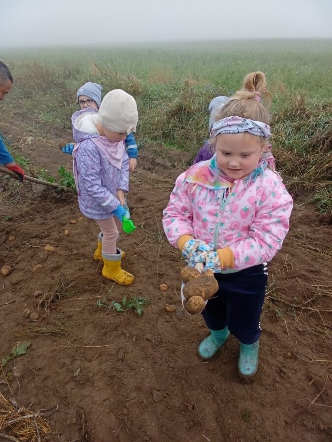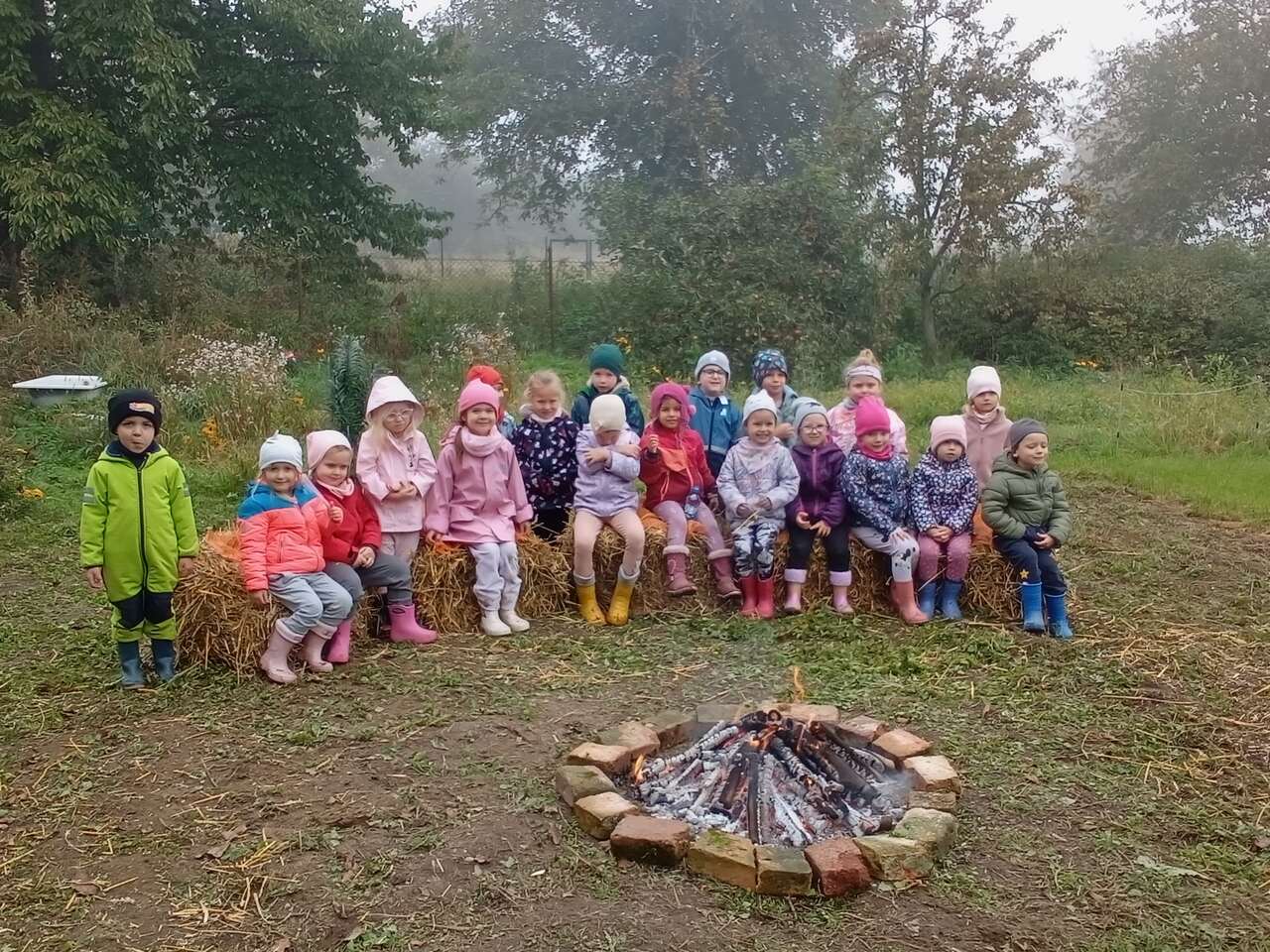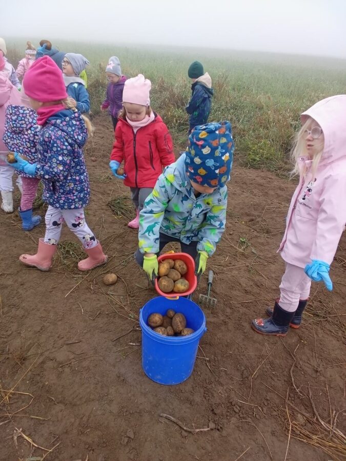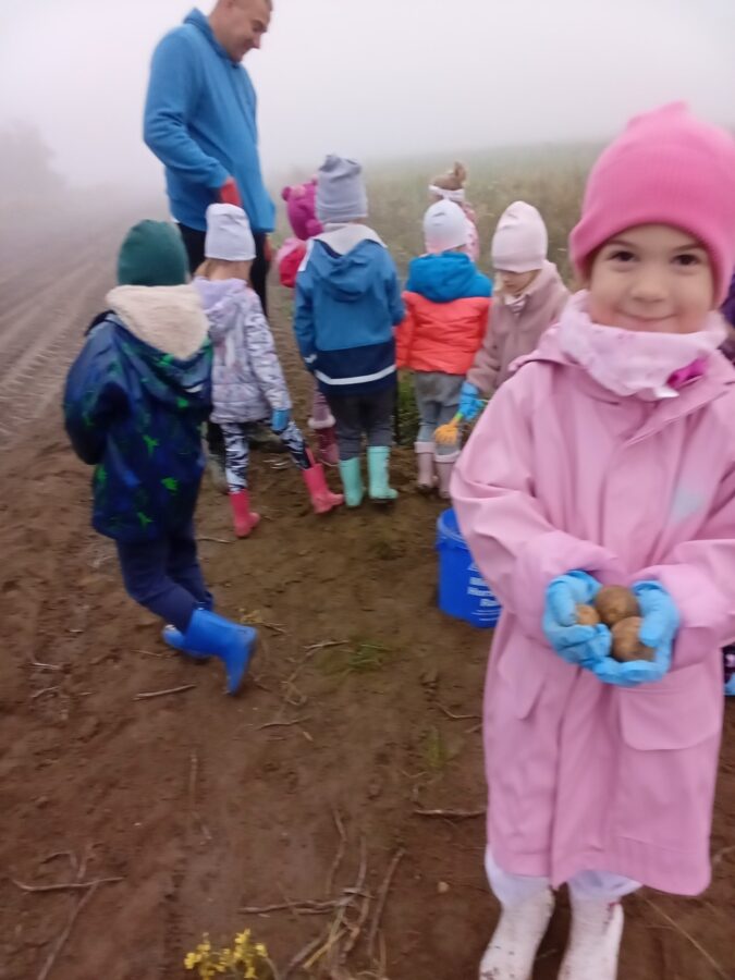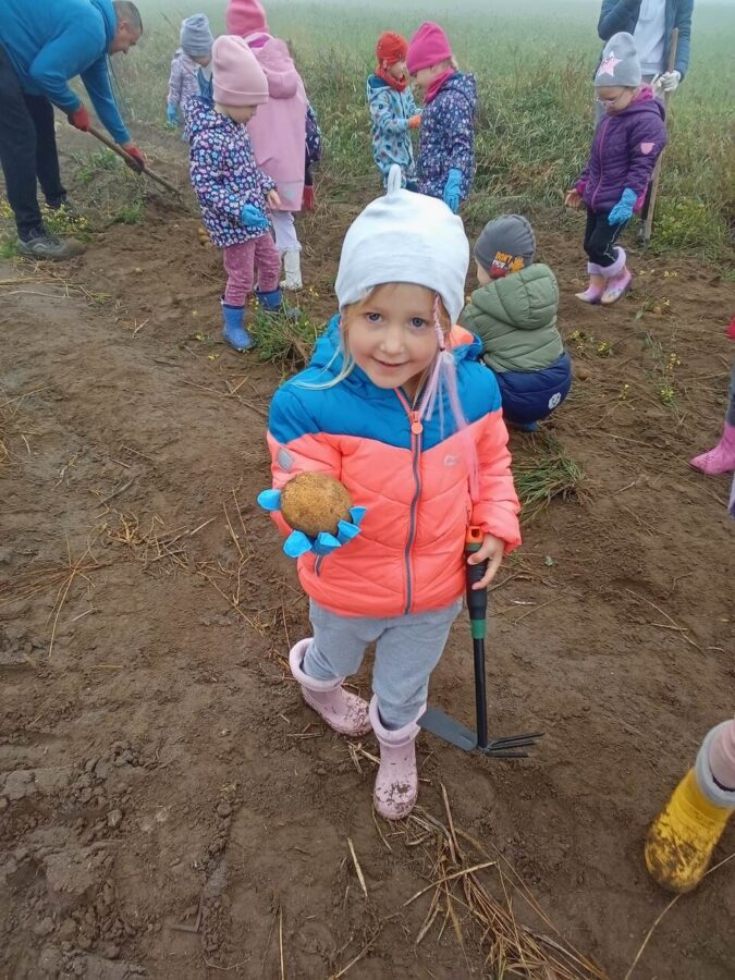 2 października grupa Pszczółki pojechała na wycieczkę do gospodarstwa rolnego Anny Rakoczy.  Przedszkolaki zwiedziły gospodarstwo. Pani Joanna opowiedziała dzieciom o ciężkiej pracy na roli. Pokazała dzieciom niezbędne do pracy narzędzia i maszyny. Przedszkolaki obserwowały wykopywanie przez pana Krzysztofa  ziemniaków, by po chwili wziąć udział w wykopkach – zbieraniu ziemniaków. Zebrane ziemniaki zsypywaliśmy do przygotowanych worków. Dzieci pracowały pilnie niczym pszczółki. Uwieńczeniem ciężkiej pracy było pieczenie kiełbasek i wspólny poczęstunek. Dziękujemy państwu Pieniążek za pomoc w zorganizowaniu wycieczki i podzielenie się wiedzą. Radość dzieci była bezcenna.