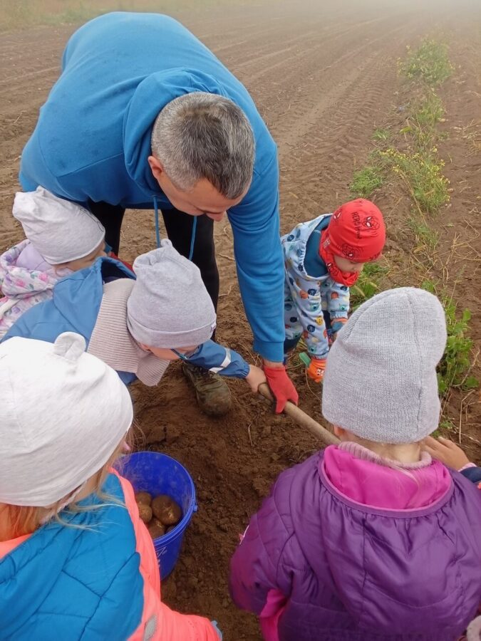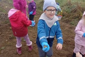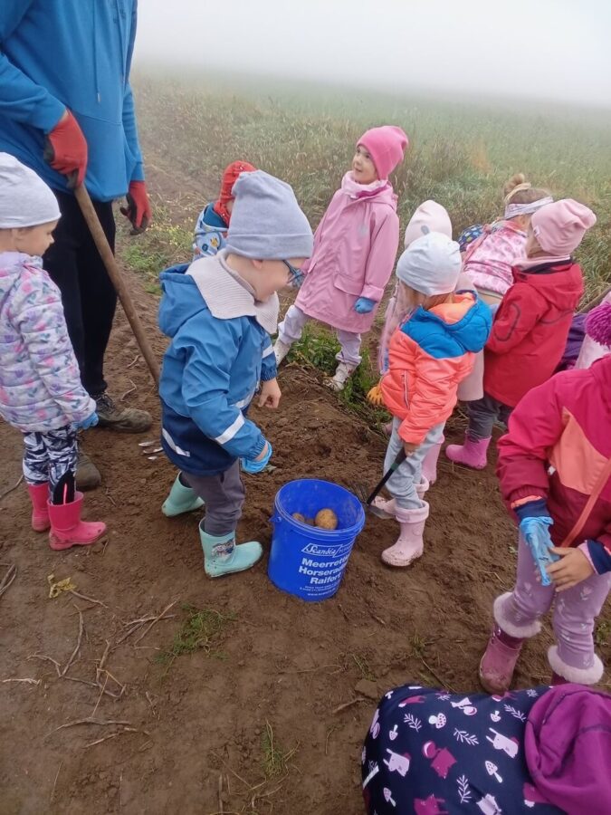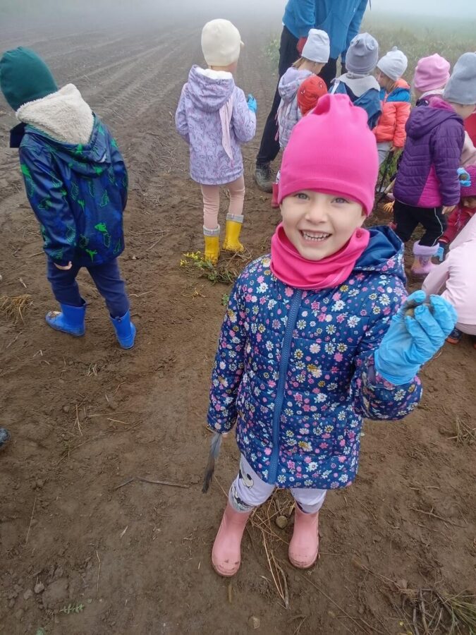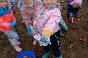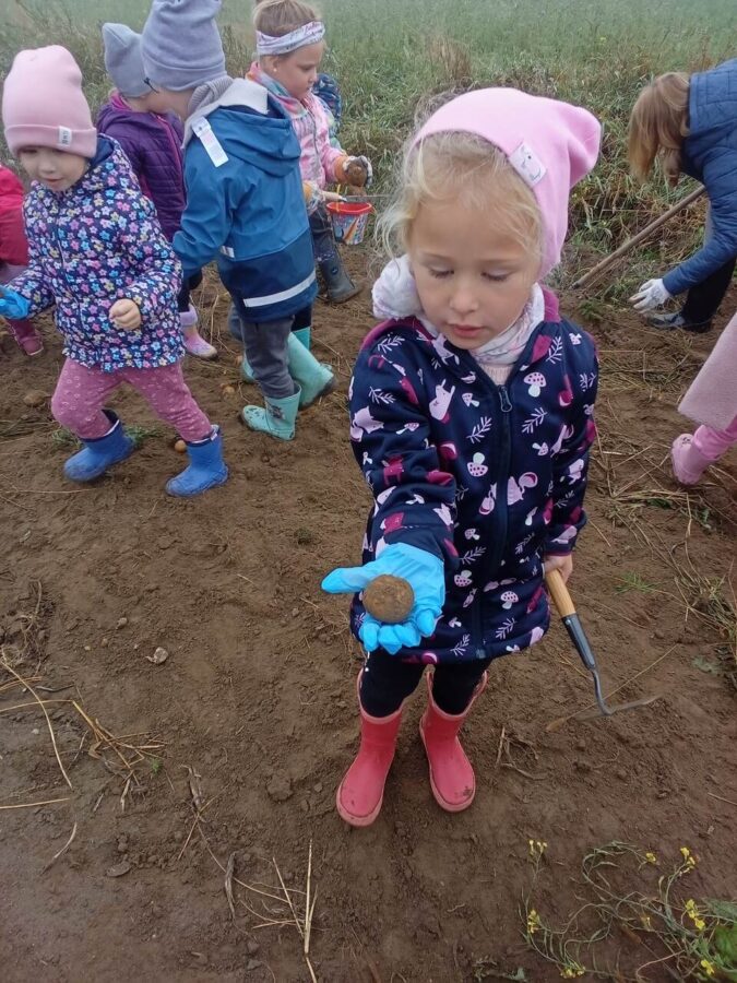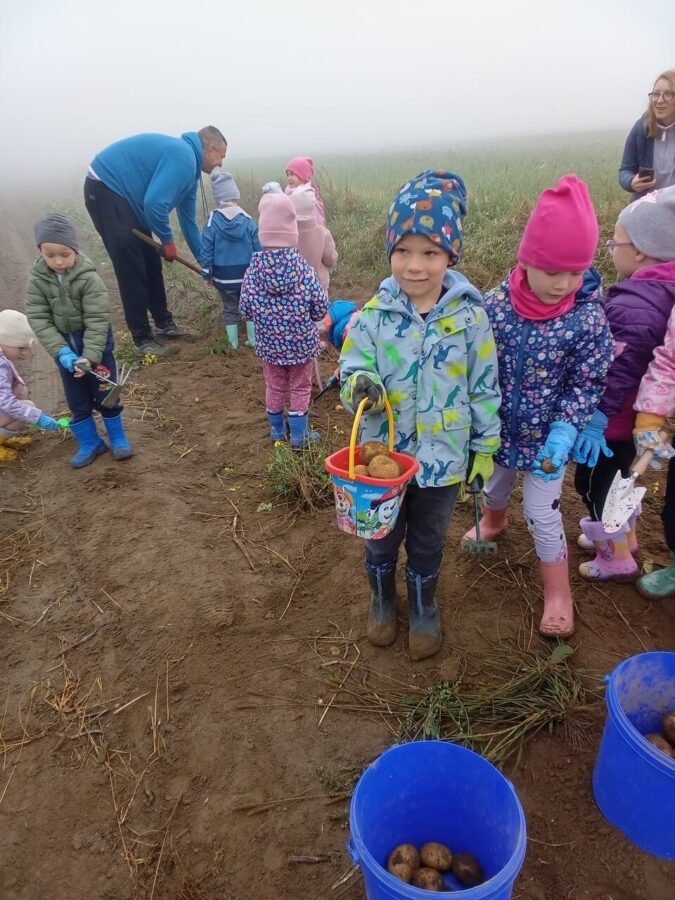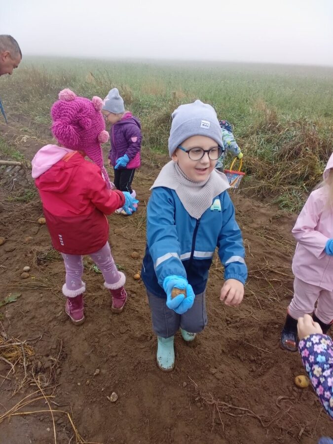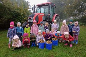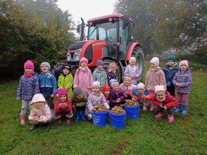 2 października grupa Pszczółki pojechała na wycieczkę do gospodarstwa rolnego Anny Rakoczy.  Przedszkolaki zwiedziły gospodarstwo. Pani Joanna opowiedziała dzieciom o ciężkiej pracy na roli. Pokazała dzieciom niezbędne do pracy narzędzia i maszyny. Przedszkolaki obserwowały wykopywanie przez pana Krzysztofa  ziemniaków, by po chwili wziąć udział w wykopkach – zbieraniu ziemniaków. Zebrane ziemniaki zsypywaliśmy do przygotowanych worków. Dzieci pracowały pilnie niczym pszczółki. Uwieńczeniem ciężkiej pracy było pieczenie kiełbasek i wspólny poczęstunek. Dziękujemy państwu Pieniążek za pomoc w zorganizowaniu wycieczki i podzielenie się wiedzą. Radość dzieci była bezcenna.