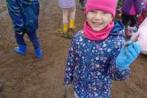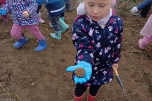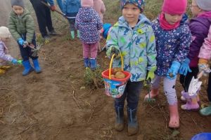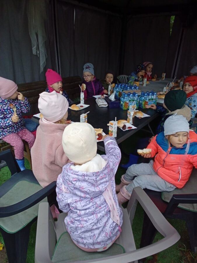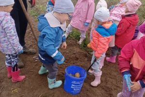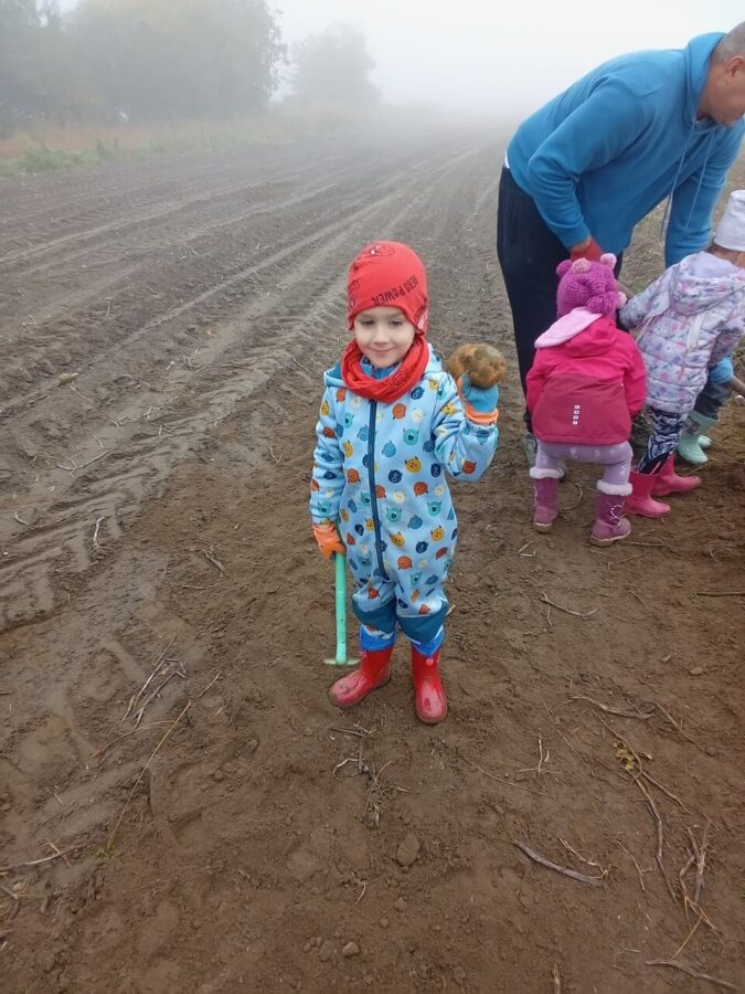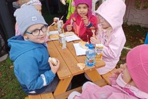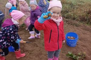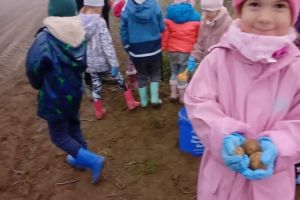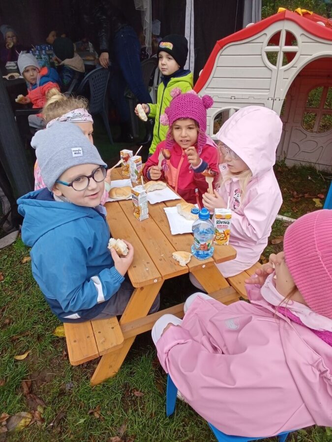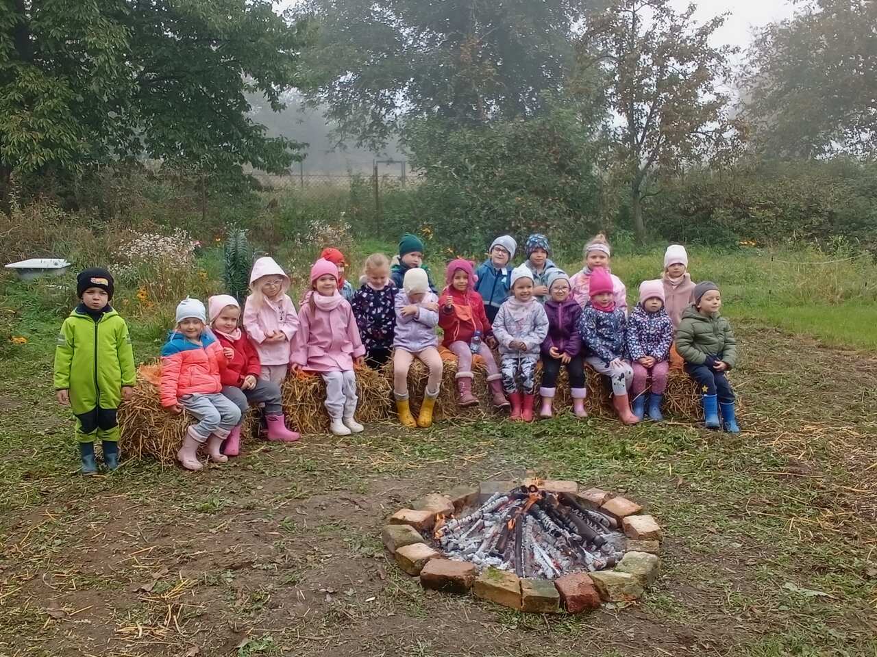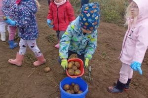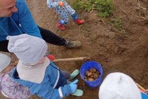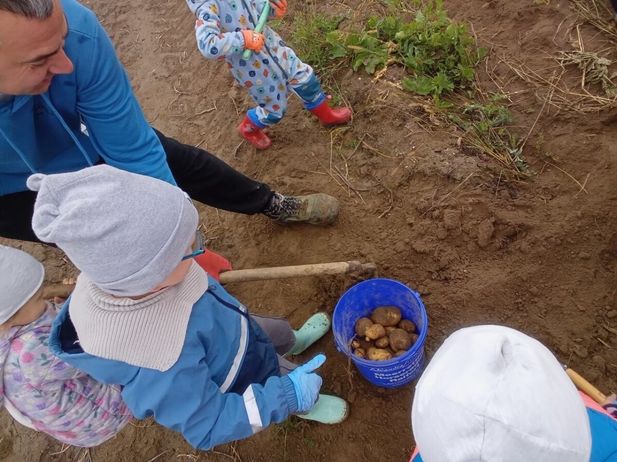 2 października grupa Pszczółki pojechała na wycieczkę do gospodarstwa rolnego Anny Rakoczy.  Przedszkolaki zwiedziły gospodarstwo. Pani Joanna opowiedziała dzieciom o ciężkiej pracy na roli. Pokazała dzieciom niezbędne do pracy narzędzia i maszyny. Przedszkolaki obserwowały wykopywanie przez pana Krzysztofa  ziemniaków, by po chwili wziąć udział w wykopkach – zbieraniu ziemniaków. Zebrane ziemniaki zsypywaliśmy do przygotowanych worków. Dzieci pracowały pilnie niczym pszczółki. Uwieńczeniem ciężkiej pracy było pieczenie kiełbasek i wspólny poczęstunek. Dziękujemy państwu Pieniążek za pomoc w zorganizowaniu wycieczki i podzielenie się wiedzą. Radość dzieci była bezcenna.