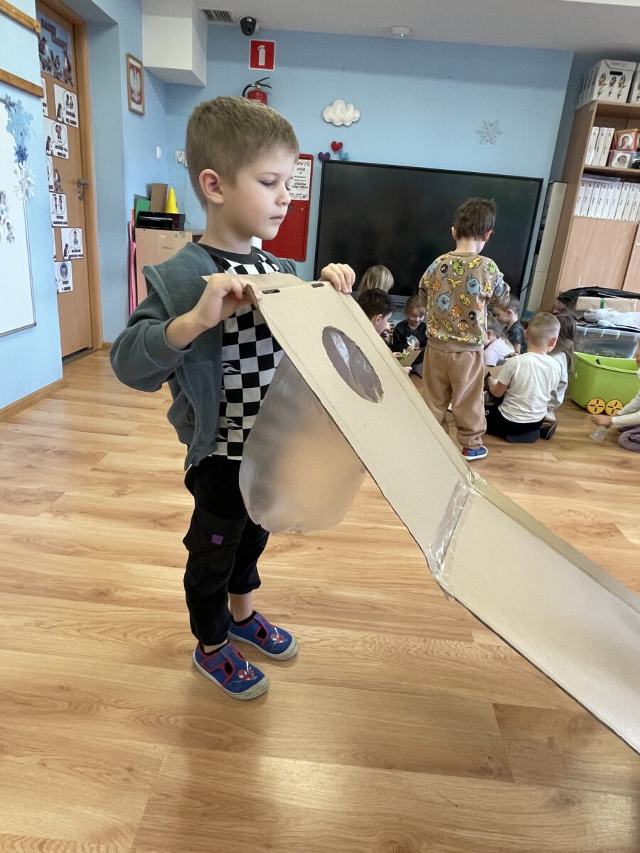 - Ekologiczna zabawka – celem tego tematu było ukazanie dzieciom prostego sposobu na wykonanie zabawki z recyklingu, że za pomocą niewielkiego wysiłku można zorganizować sobie czas poprzez świetną zabawę. Dzieci wykonały grzechotki z papierowych kubków i ryżu, które zostały pomalowane farbami i wykorzystane do zabaw muzycznych oraz gąsienicę z kawałka kartonu i sznurka, którą wykorzystaliśmy do zabaw sensorycznych kształtując jednocześnie motorykę małą i wyobraźnię.