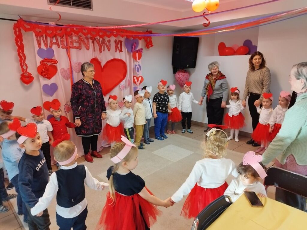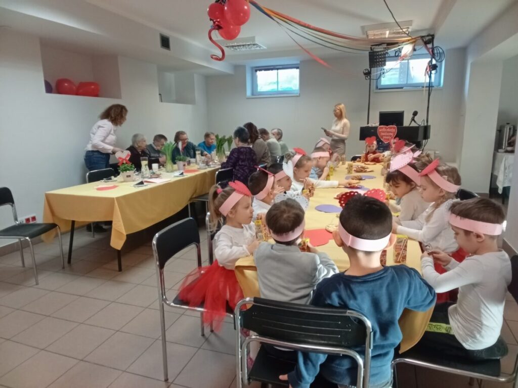 7 lutego 2023 roku nasze przedszkole odwiedzili pensjonariusze Domu Pomocy Społecznej „Ostoja” w Zgorzelcu. Dzieci z grupy ,,Pszczółki” bardzo ładnie przywitały gości prezentując piosenki i zabawy tematyczne. Wszyscy świetnie się bawili pozując do walentynkowej fotobudki oraz tańcząc tradycyjne zabawy kołowe. Zaproszeni goście oraz dzieci na koniec wspólnego spotkanie biesiadowali przy wspólnym stole. ,,Pszczółki” przekazały gościom piękne laurki oraz drobne upominki, które same przygotowały, co wywołało dużo radości i uśmiechu u obdarowanych.