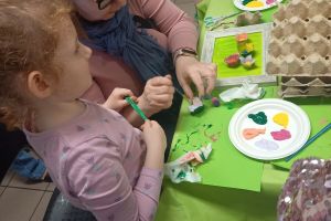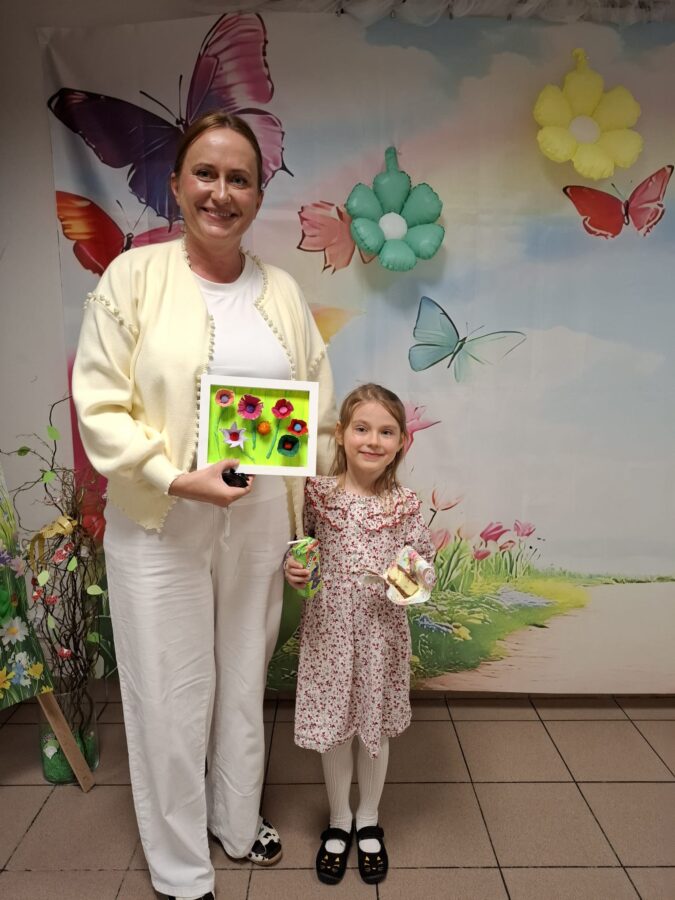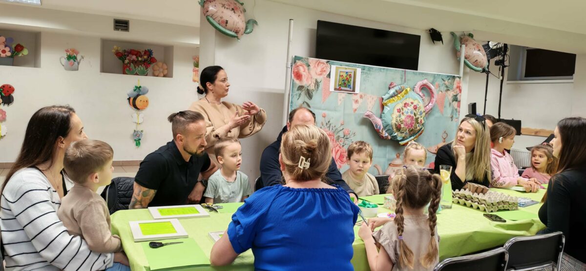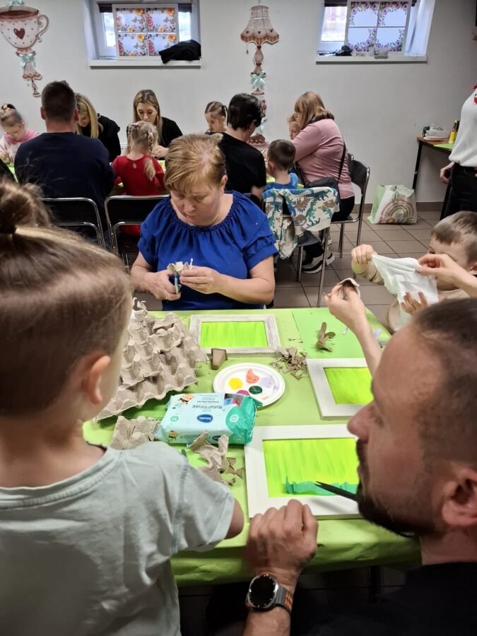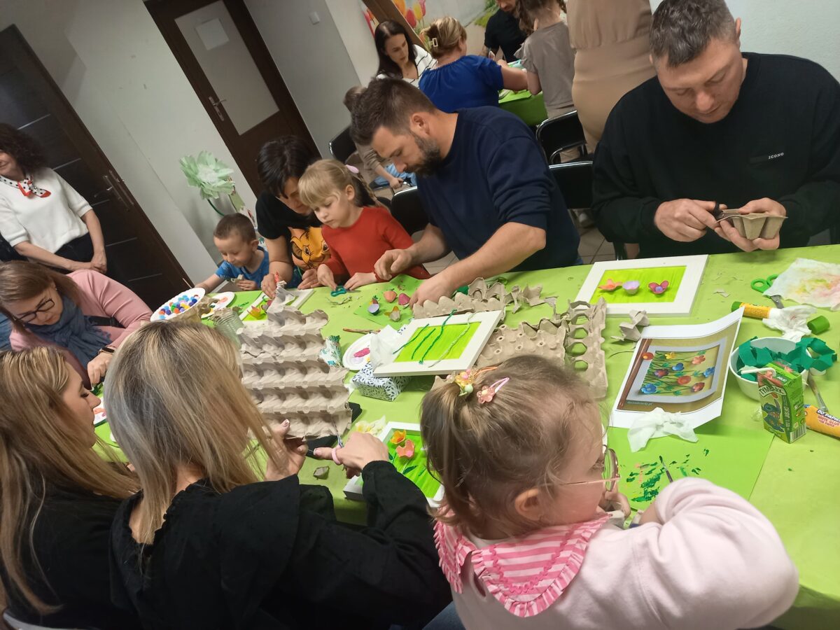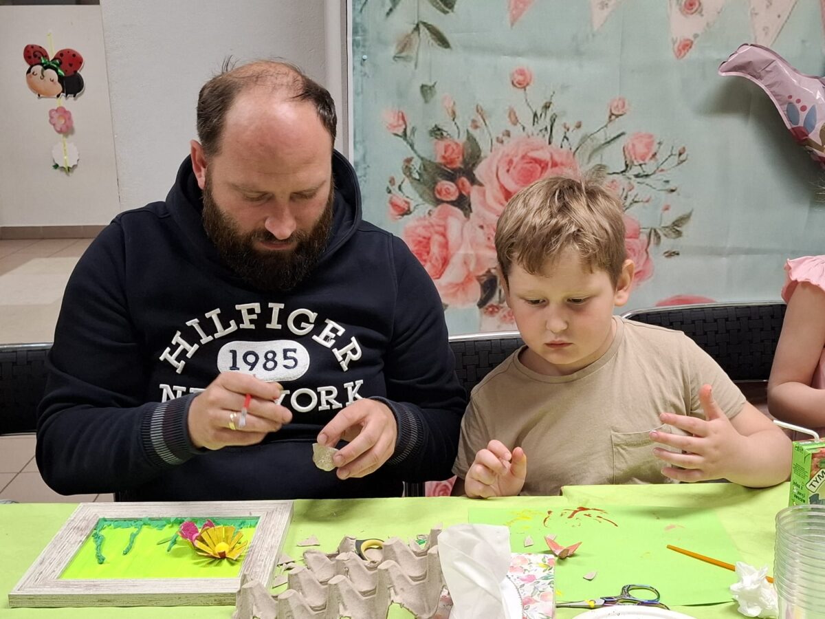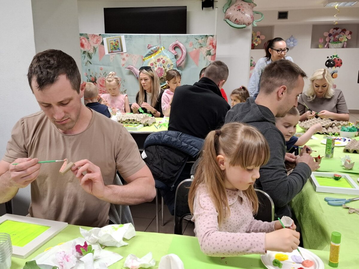 23 kwietnia 2026 roku w grupie Słowiki odbyły się warsztaty plastyczno- techniczne z udziałem rodziców. Przedszkolaki zaprezentowały piosenki wiosenne ,,Hop hop wiosna”, ,,Idzie wiosna”, zagadki wiosenne czytane rodzicom przez Gabrysię oraz taniec z chustkami,,Wiosna wiosenka” wprowadzając wszystkich w temat spotkania, którego celem było wykonanie wiosennej łąki w przygotowanej ramce. Następnie dzieci wraz z rodzicami wykonali taniec przy piosence ,,Krasnoludek”. Wszyscy z zaangażowaniem wykonywali powierzone zadanie i powstały piękne wiosenne obrazy, które rodzice z dziećmi mogli zabrać do domu. Kolejnym etapem spotkania była degustacja pysznych ciast przygotowanych przez rodziców. W bardzo dobrych nastrojach nasze spotkanie dobiegło końca. Dziękujemy rodzicom za obecność i zaangażowanie.