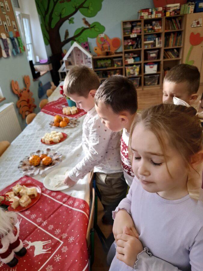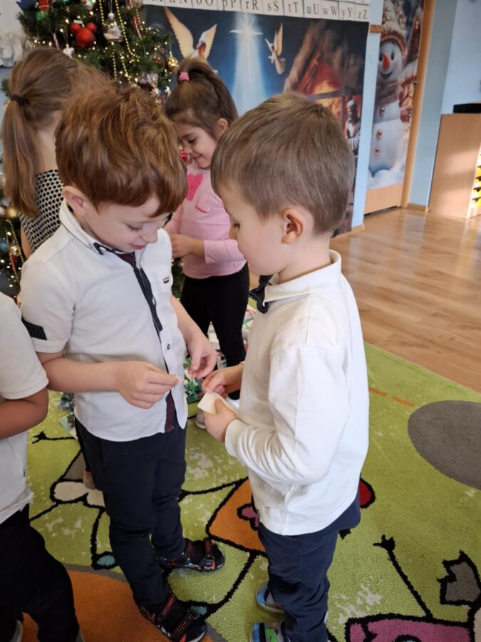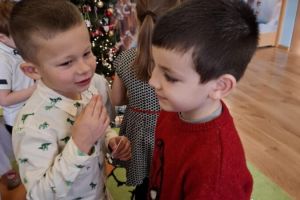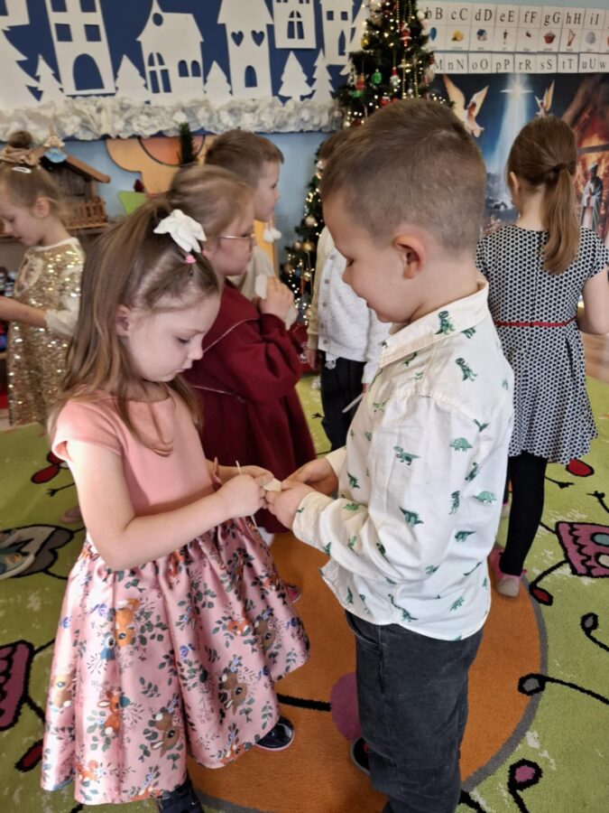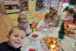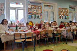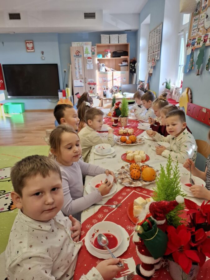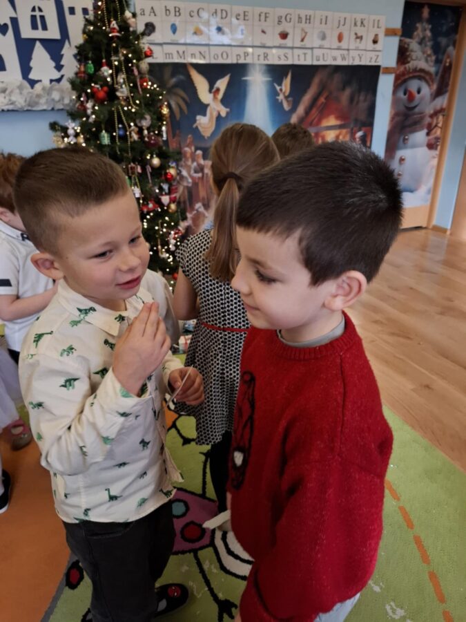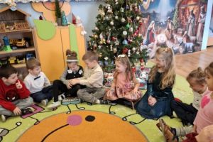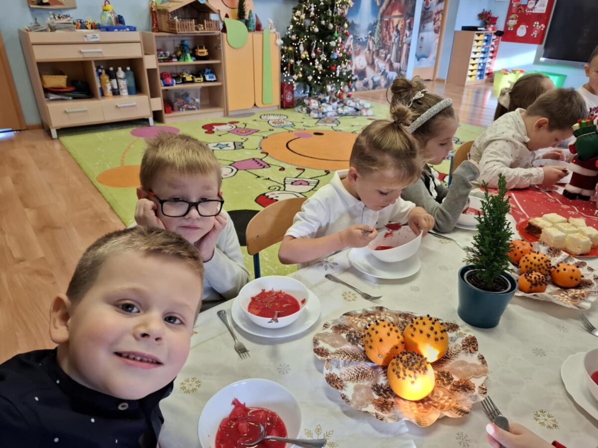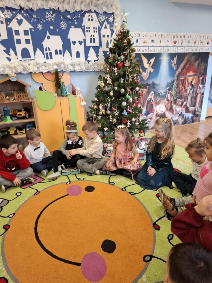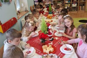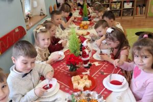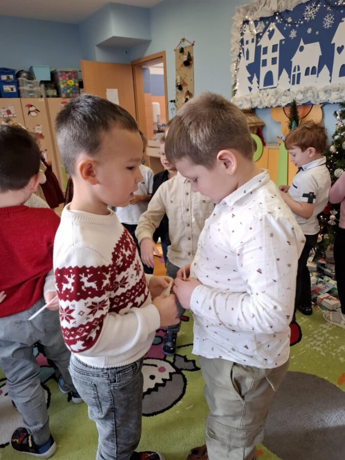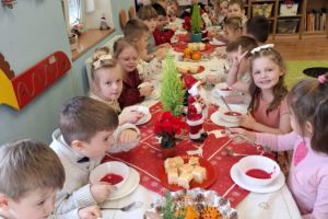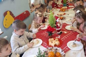 Dzisiaj w naszej grupie panowała radosna atmosfera. Świąteczne dekoracje, Muzyka oraz dzieci w eleganckich strojach wprowadziły nastrój w przedszkolnej sali. Uroczystość rozpoczęła się opowiadaniem historii o narodzinach Jezusa. Nie zabrakło dzielenia się opłatkiem, śpiewania kolęd no i uroczystego obiadu. Na koniec na dzieci czekały prezenty, które jakimś cudem trafiły pod choinkę. To było wyjątkowe przeżycie.