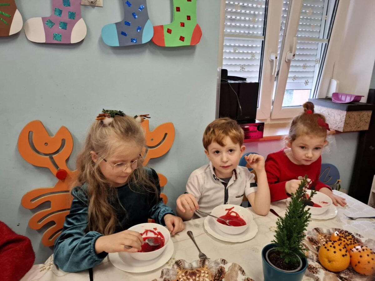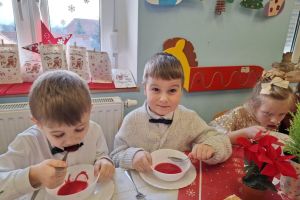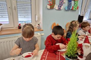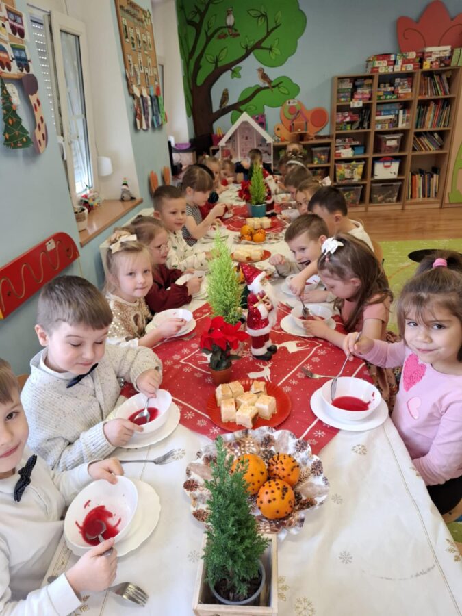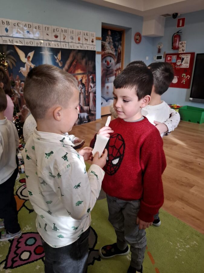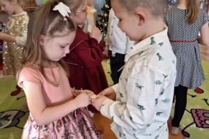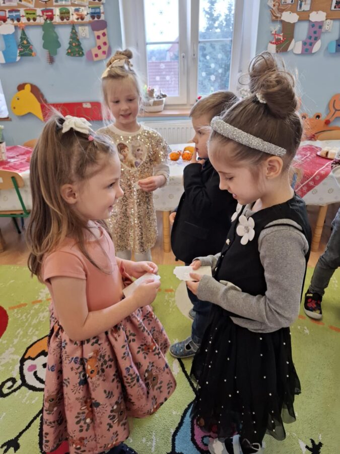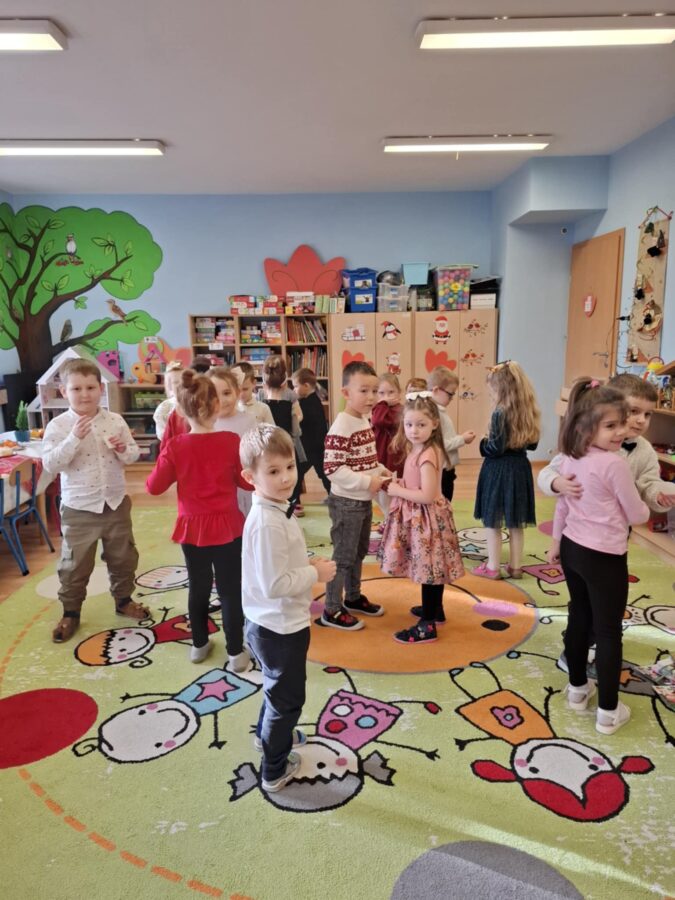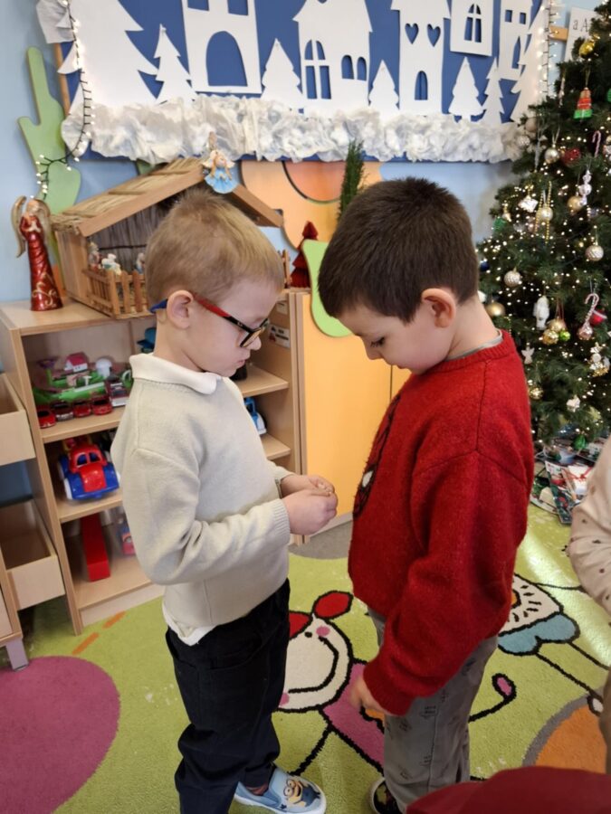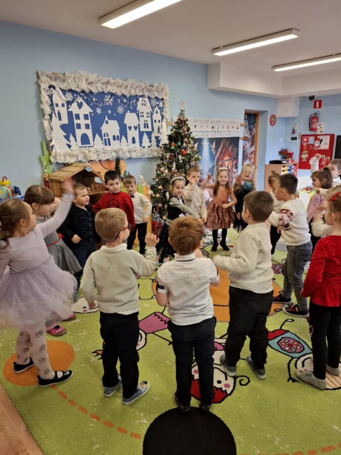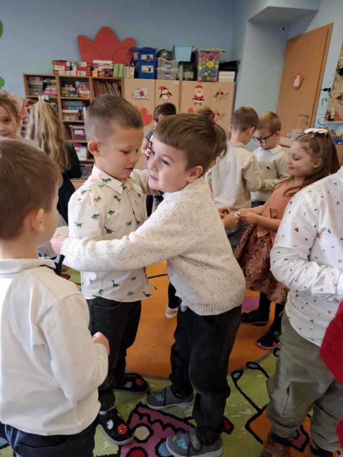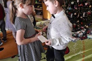 Dzisiaj w naszej grupie panowała radosna atmosfera. Świąteczne dekoracje, Muzyka oraz dzieci w eleganckich strojach wprowadziły nastrój w przedszkolnej sali. Uroczystość rozpoczęła się opowiadaniem historii o narodzinach Jezusa. Nie zabrakło dzielenia się opłatkiem, śpiewania kolęd no i uroczystego obiadu. Na koniec na dzieci czekały prezenty, które jakimś cudem trafiły pod choinkę. To było wyjątkowe przeżycie.