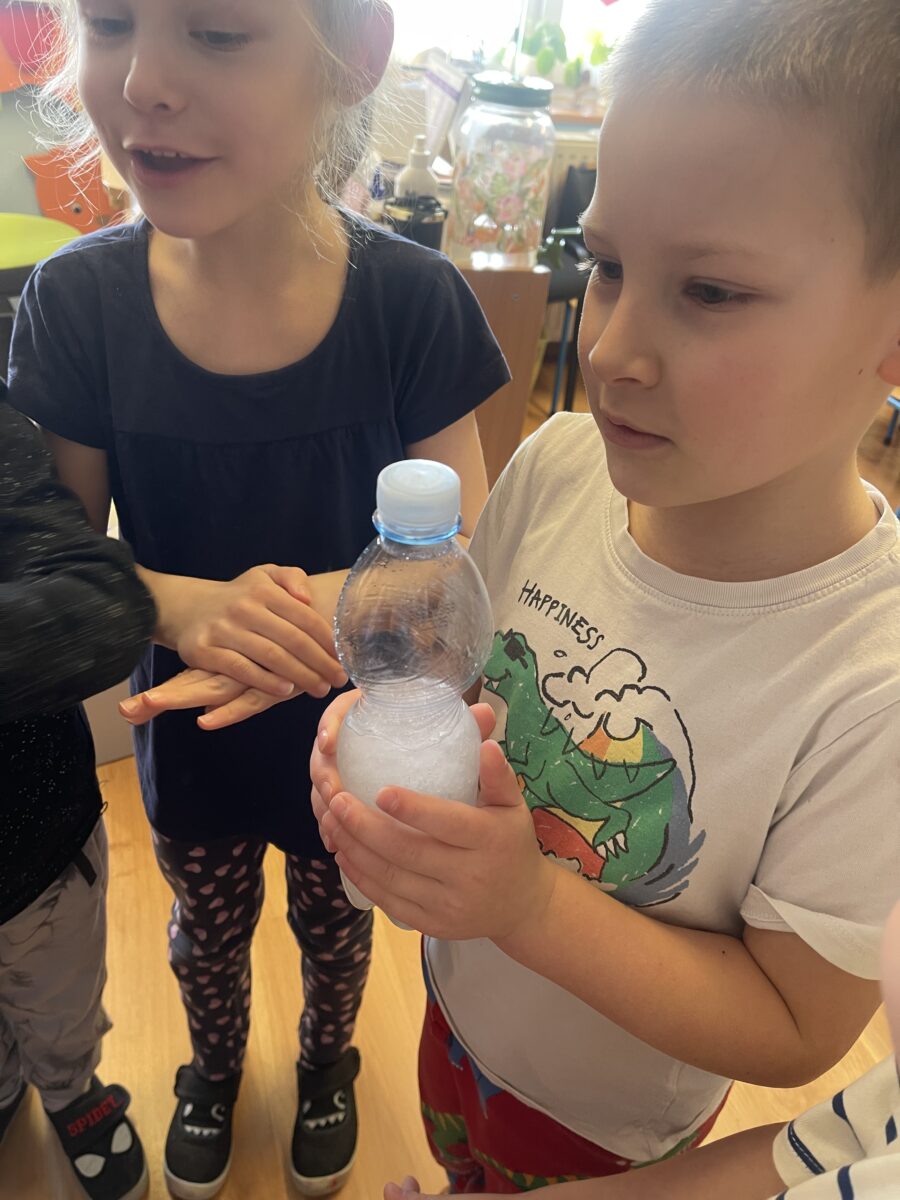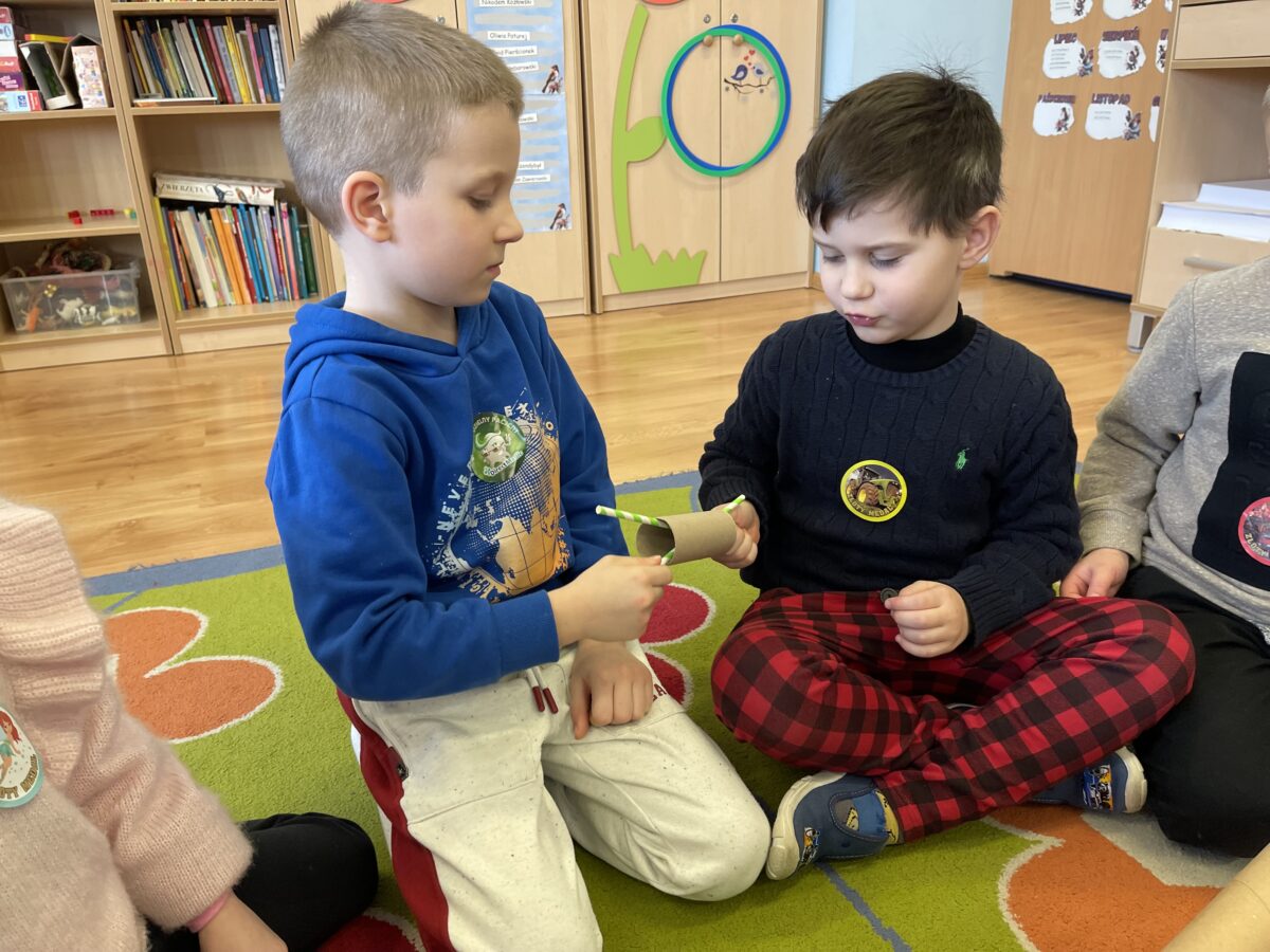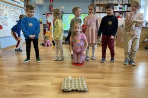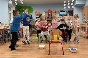 - Ekologiczna zabawka – celem tego tematu było ukazanie dzieciom prostego sposobu na wykonanie zabawki z recyklingu, że za pomocą niewielkiego wysiłku można zorganizować sobie czas poprzez świetną zabawę. Dzieci brały udział w zabawach grupowych kształtujących ogólną sprawność ruchową w wykorzystaniem produktu z odzysku, tj. zakrętki, rolki po papierze, woreczki.