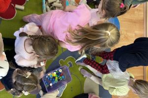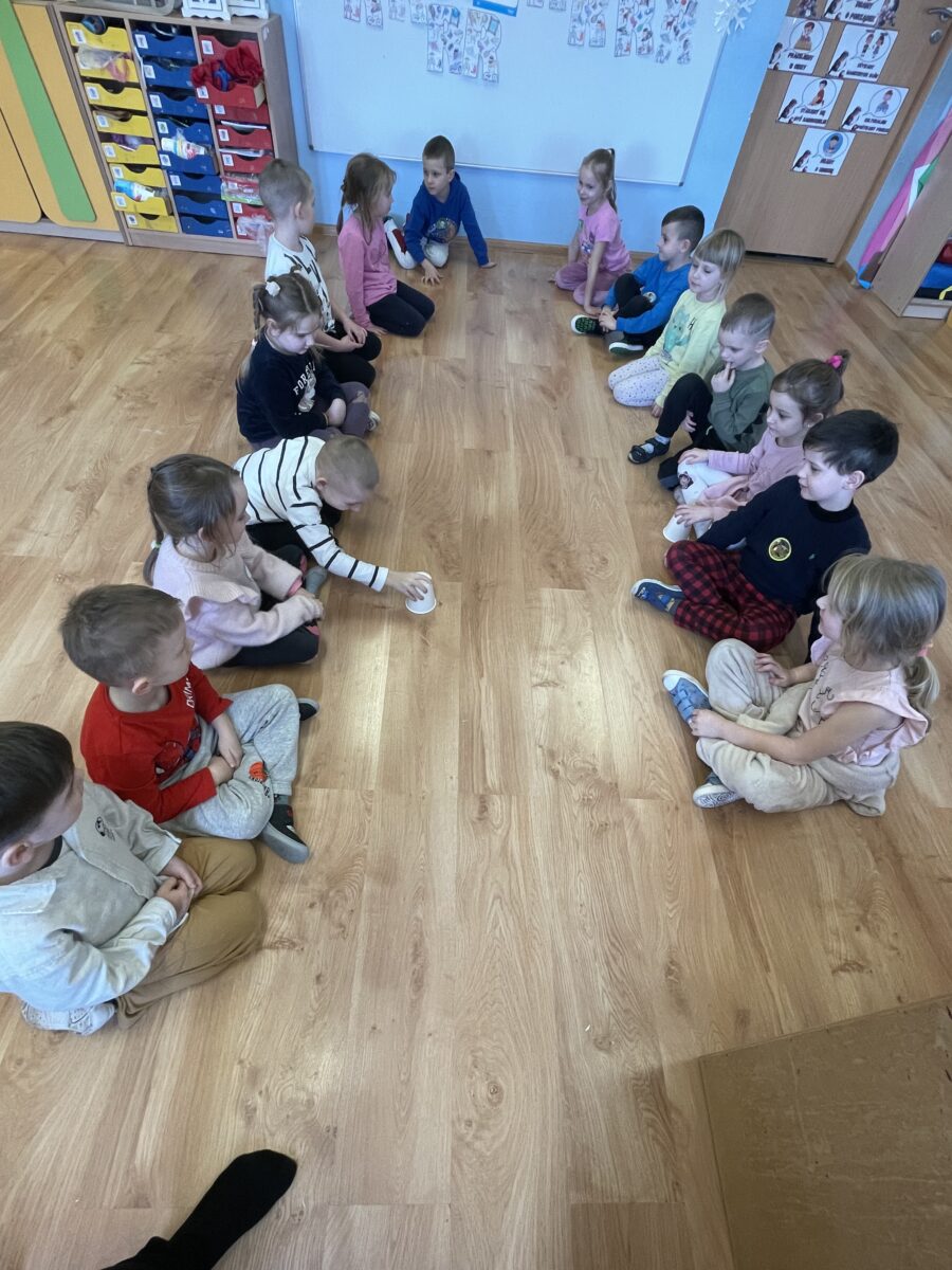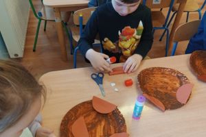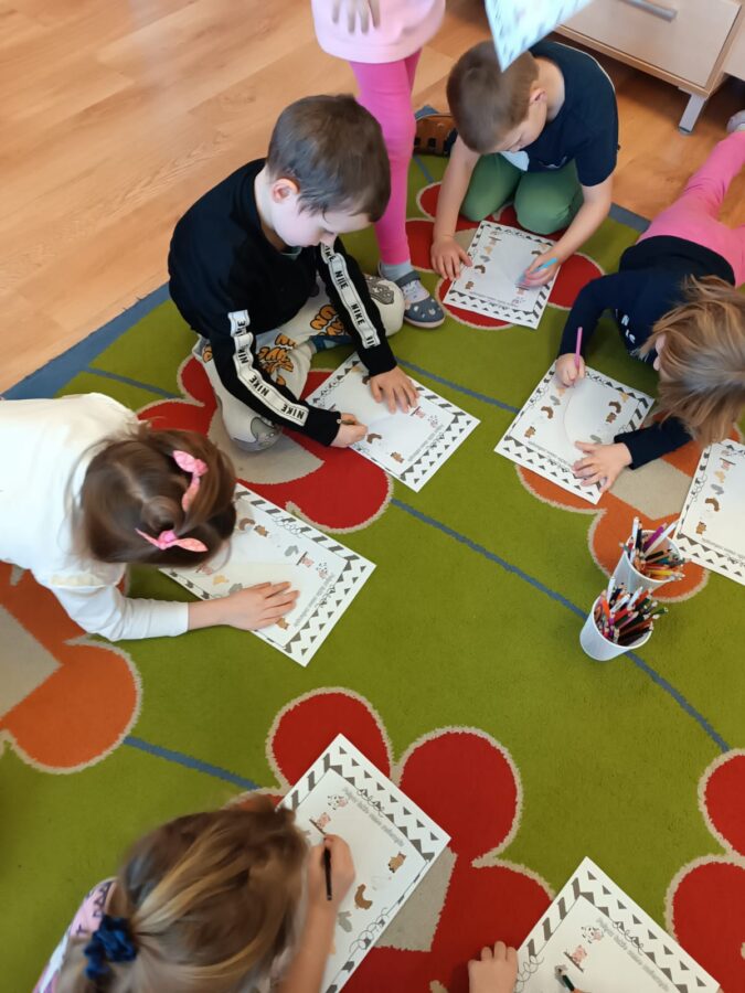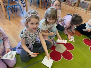 - Zwierzęta wokół nas – dzieci rozwiązywały zagadki o zwierzętach, łączyły w pary te same zwierzęta, wspólnie wyjaśnialiśmy od jakich zwierząt pochodzą poszczególne produkty. Dzieci wykonywały pracę plastyczną (przestrzenne origami z papierowych talerzyków – piesek). Podczas drugich zajęć dzieci miały okazję obejrzeć krótki film edukacyjny o zwierzętach domowych, dowiedzieć się w jakich warunkach żyją i gdzie dokładnie. Słowiki liczyły również zwierzątka i zaznaczały odpowiednią cyfrę pod obrazkiem, bawiły się wspólnie z chustą animacyjną oraz wykonały pracę plastyczno – techniczną z rolki po papierze .